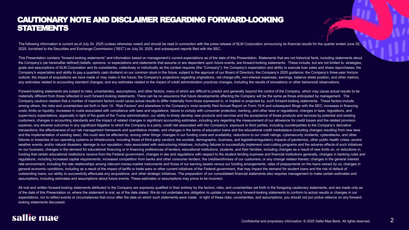 2Confidential and proprietary information. © 2025 Sallie Mae Bank. All rights reserved. The following information is current as of July 24, 2025 (unless otherwise noted) and should be read in connection with the press release of SLM Corporation announcing its financial results for the quarter ended June 30, 2025, furnished to the Securities and Exchange Commission (“SEC”) on July 24, 2025, and subsequent reports filed with the SEC. This Presentation contains “forward-looking statements” and information based on management’s current expectations as of the date of this Presentation. Statements that are not historical facts, including statements about the Company’s (as hereinafter defined) beliefs, opinions, or expectations and statements that assume or are dependent upon future events, are forward-looking statements. These include, but are not limited to: strategies; goals and assumptions of SLM Corporation and its subsidiaries, collectively or individually as the context requires (the “Company”); the Company’s expectation and ability to execute loan sales and share repurchases; the Company’s expectation and ability to pay a quarterly cash dividend on our common stock in the future, subject to the approval of our Board of Directors; the Company’s 2025 guidance; the Company’s three-year horizon outlook; the impact of acquisitions we have made or may make in the future; the Company’s projections regarding originations, net charge-offs, non-interest expenses, earnings, balance sheet position, and other metrics; any estimates related to accounting standard changes; and any estimates related to the impact of credit administration practices changes, including the results of simulations or other behavioral observations. Forward-looking statements are subject to risks, uncertainties, assumptions, and other factors, many of which are difficult to predict and generally beyond the control of the Company, which may cause actual results to be materially different from those reflected in such forward-looking statements. There can be no assurance that future developments affecting the Company will be the same as those anticipated by management. The Company cautions readers that a number of important factors could cause actual results to differ materially from those expressed in, or implied or projected by, such forward-looking statements. These factors include, among others, the risks and uncertainties set forth in Item 1A. “Risk Factors” and elsewhere in the Company’s most recently filed Annual Report on Form 10-K and subsequent filings with the SEC; increases in financing costs; limits on liquidity; increases in costs associated with compliance with laws and regulations; failure to comply with consumer protection, banking, and other laws or regulations; changes in laws, regulations, and supervisory expectations, especially in light of the goals of the Trump administration; our ability to timely develop new products and services and the acceptance of those products and services by potential and existing customers; changes in accounting standards and the impact of related changes in significant accounting estimates, including any regarding the measurement of our allowance for credit losses and the related provision expense; any adverse outcomes in any significant litigation to which the Company is a party; credit risk associated with the Company’s exposure to third parties, including counterparties to the Company’s derivative transactions; the effectiveness of our risk management framework and quantitative models; and changes in the terms of education loans and the educational credit marketplace (including changes resulting from new laws and the implementation of existing laws). We could also be affected by, among other things: changes in our funding costs and availability; reductions to our credit ratings; cybersecurity incidents, cyberattacks, and other failures or breaches of our operating systems or infrastructure, including those of third-party vendors; the societal, demographic, business, and legislative/regulatory impacts of pandemics, other public health crises, severe weather events, and/or natural disasters; damage to our reputation; risks associated with restructuring initiatives, including failures to successfully implement cost-cutting programs and the adverse effects of such initiatives on our business; changes in the demand for educational financing or in financing preferences of lenders, educational institutions, students, and their families, including changes as a result of new limits on, or reductions in, funding that certain educational institutions receive from the Federal government; changes in law and regulations with respect to the student lending business and financial institutions generally; changes in banking rules and regulations, including increased capital requirements; increased competition from banks and other consumer lenders; the creditworthiness of our customers, or any change related thereto; changes in the general interest rate environment, including the rate relationships among relevant money-market instruments and those of our earning assets versus our funding arrangements; rates of prepayments on the loans owned by us; changes in general economic conditions, including as a result of the impact of tariffs or trade wars or other current initiatives of the Federal government, that may impact the demand for student loans and the risk of default of outstanding loans; our ability to successfully effectuate any acquisitions; and other strategic initiatives. The preparation of our consolidated financial statements also requires management to make certain estimates and assumptions, including estimates and assumptions about future events. These estimates or assumptions may prove to be incorrect. All oral and written forward-looking statements attributed to the Company are expressly qualified in their entirety by the factors, risks, and unc