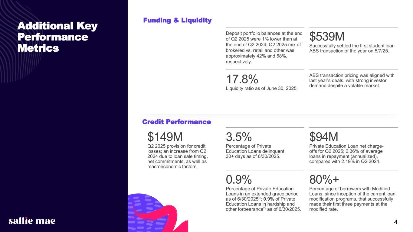 3 $67M GAAP Net Income attributable to common stock in Q2 2025. $0.32 Q2 2025 GAAP diluted earnings per common share. 5.31% Net interest margin for Q2 2025; a decrease of 5 basis points from Q2 2024. $167M Total non-interest expenses in Q2 2025, as compared to $159M total non-interest expenses in the year-ago quarter. 2nd Quarter 2025 Highlights $686M Private Education Loan Originations(1) in Q2 2025 as compared to $691M in the year-ago quarter. $0.13 Common stock dividend per share paid in Q2 2025. 12.6% Return on Common Equity (2) for Q2 2025. 12.8% Total risk-based capital ratio; CET1 capital ratio of 11.5%. 2.4M Shares repurchased in Q2 2025 under the 2024 share repurchase program at an avg. price of $29.46 per share; $302 million of capacity left under repurchase program authorization as of June 30, 2025. Balance Sheet & Capital Allocation Income Statement & Earnings Summary