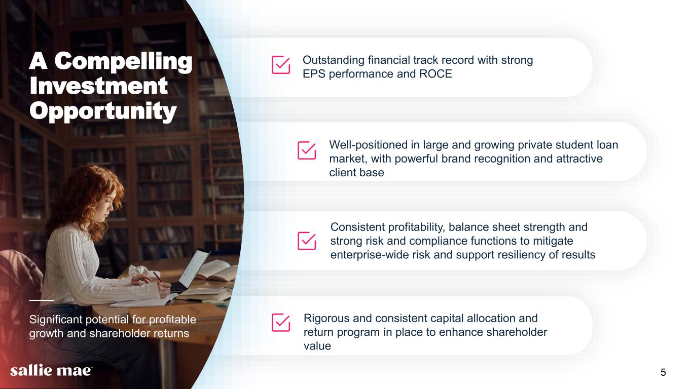4 $149M Q2 2025 provision for credit losses; an increase from Q2 2024 due to loan sale timing, net commitments, as well as macroeconomic factors. 3.5% Percentage of Private Education Loans delinquent 30+ days as of 6/30/2025. $94M Private Education Loan net charge- offs for Q2 2025; 2.36% of average loans in repayment (annualized), compared with 2.19% in Q2 2024. 0.9% Percentage of Private Education Loans in an extended grace period as of 6/30/2025 (3) ; 0.9% of Private Education Loans in hardship and other forbearance (4) as of 6/30/2025. 80%+ Percentage of borrowers with Modified Loans, since inception of the current loan modification programs, that successfully made their first three payments at the modified rate. Additional Key Performance Metrics Credit Performance Funding & Liquidity Deposit portfolio balances at the end of Q2 2025 were 1% lower than at the end of Q2 2024; Q2 2025 mix of brokered vs. retail and other was approximately 42% and 58%, respectively. $539M Successfully settled the first student loan ABS transaction of the year on 5/7/25. 17.8% Liquidity ratio as of June 30, 2025. ABS transaction pricing was aligned with last year’s deals, with strong investor demand despite a volatile market.