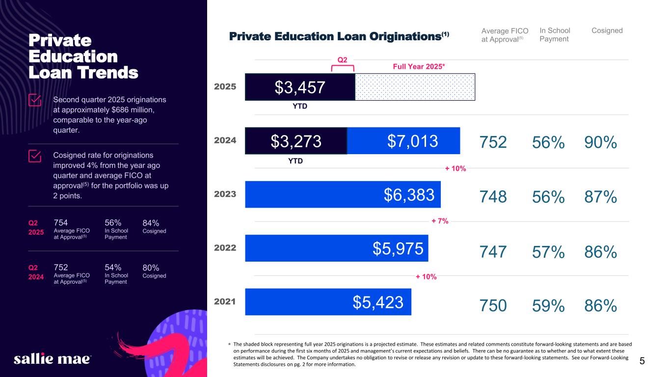 4 $149M Q2 2025 provision for credit losses; an increase from Q2 2024 due to loan sale timing, net commitments, as well as macroeconomic factors. 3.5% Percentage of Private Education Loans delinquent 30+ days as of 6/30/2025. $94M Private Education Loan net charge- offs for Q2 2025; 2.36% of average loans in repayment (annualized), compared with 2.19% in Q2 2024. 0.9% Percentage of Private Education Loans in an extended grace period as of 6/30/2025 (3) ; 0.9% of Private Education Loans in hardship and other forbearance (4) as of 6/30/2025. 80%+ Percentage of borrowers with Modified Loans, since inception of the current loan modification programs, that successfully made their first three payments at the modified rate. Additional Key Performance Metrics Credit Performance Funding & Liquidity Deposit portfolio balances at the end of Q2 2025 were 1% lower than at the end of Q2 2024; Q2 2025 mix of brokered vs. retail and other was approximately 42% and 58%, respectively. $539M Successfully settled the first student loan ABS transaction of the year on 5/7/25. 17.8% Liquidity ratio as of June 30, 2025. ABS transaction pricing was aligned with last year’s deals, with strong investor demand despite a volatile market.