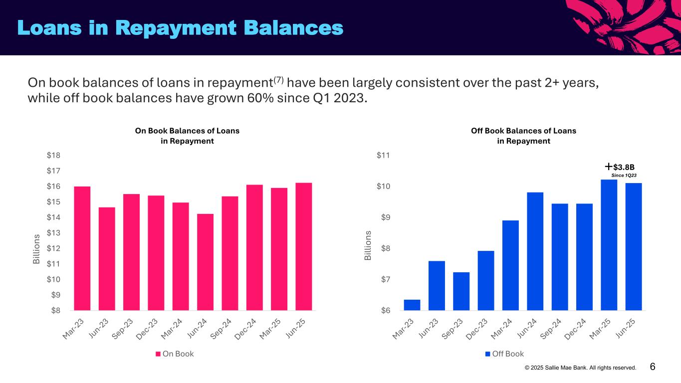 5© 2025 Sallie Mae Bank. All rights reserved. $5,423 $5,975 $6,383 $7,013 2021 2022 2023 2024 2025 87%748 56% 86%747 57% 86%750 59% Private Education Loan Trends Second quarter 2025 originations at approximately $686 million, comparable to the year-ago quarter. Cosigned rate for originations improved 4% from the year ago quarter and average FICO at approval(5) for the portfolio was up 2 points. Average FICO at Approval(5) In School Payment Cosigned Private Education Loan Originations(1) + 7% + 10% 754 Average FICO at Approval(5) 56% In School Payment 84% Cosigned Q2 2025 752 Average FICO at Approval(5) 54% In School Payment 80% Cosigned Q2 2024 + 10% * $3,457 YTD Full Year 2025* $3,273 YTD 90%752 56% * The shaded block representing full year 2025 originations is a projected estimate. These estimates and related comments constitute forward-looking statements and are based on performance during the first six months of 2025 and management’s current expectations and beliefs. There can be no guarantee as to whether and to what extent these estimates will be achieved. The Company undertakes no obligation to revise or release any revision or update to these forward-looking statements. See our Forward-Looking Statements disclosures on pg. 2 for more information. Q2
