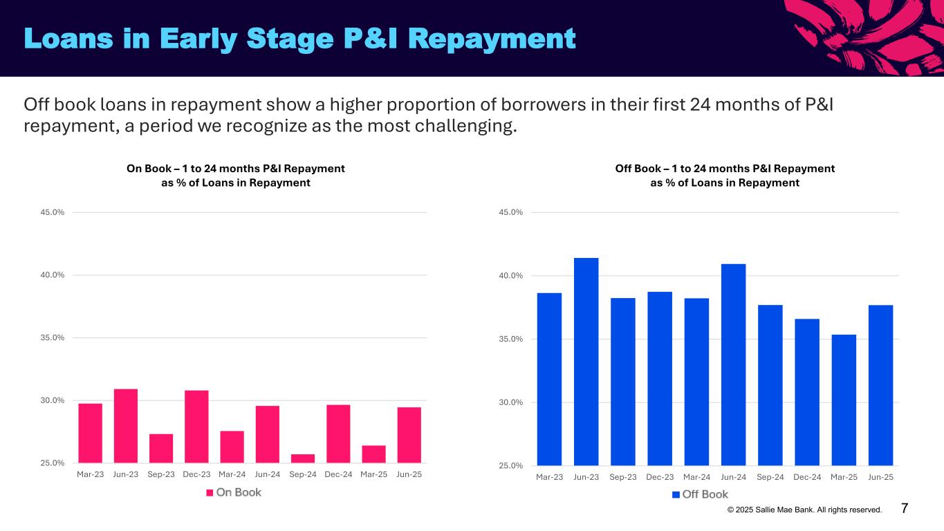 6© 2025 Sallie Mae Bank. All rights reserved. $8 $9 $10 $11 $12 $13 $14 $15 $16 $17 $18 Bi lli on s On Book $6 $7 $8 $9 $10 $11 Bi lli on s Off Book $3.8B Since 1Q23 On Book Balances of Loans in Repayment Off Book Balances of Loans in Repayment On book balances of loans in repayment(7) have been largely consistent over the past 2+ years, while off book balances have grown 60% since Q1 2023. Loans in Repayment Balances