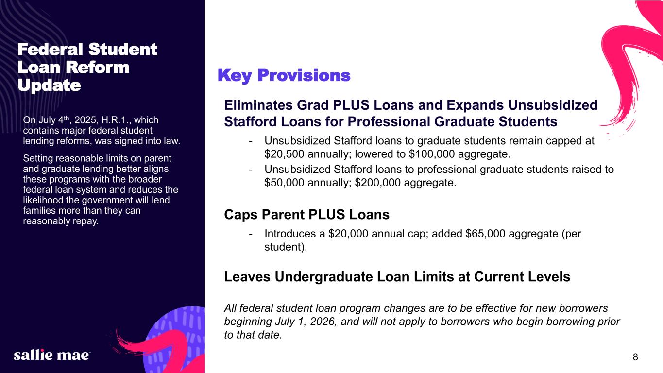 7© 2025 Sallie Mae Bank. All rights reserved. Loans in Early Stage P&I Repayment 25.0% 30.0% 35.0% 40.0% 45.0% Mar-23 Jun-23 Sep-23 Dec-23 Mar-24 Jun-24 Sep-24 Dec-24 Mar-25 Jun-25 P&I 1 to 24 25.0% 30.0% 35.0% 40.0% 45.0% Mar-23 Jun-23 Sep-23 Dec-23 Mar-24 Jun-24 Sep-24 Dec-24 Mar-25 Jun-25 P&I 1 to 24 Off book loans in repayment show a higher proportion of borrowers in their first 24 months of P&I repayment, a period we recognize as the most challenging. On Book – 1 to 24 months P&I Repayment as % of Loans in Repayment Off Book – 1 to 24 months P&I Repayment as % of Loans in Repayment