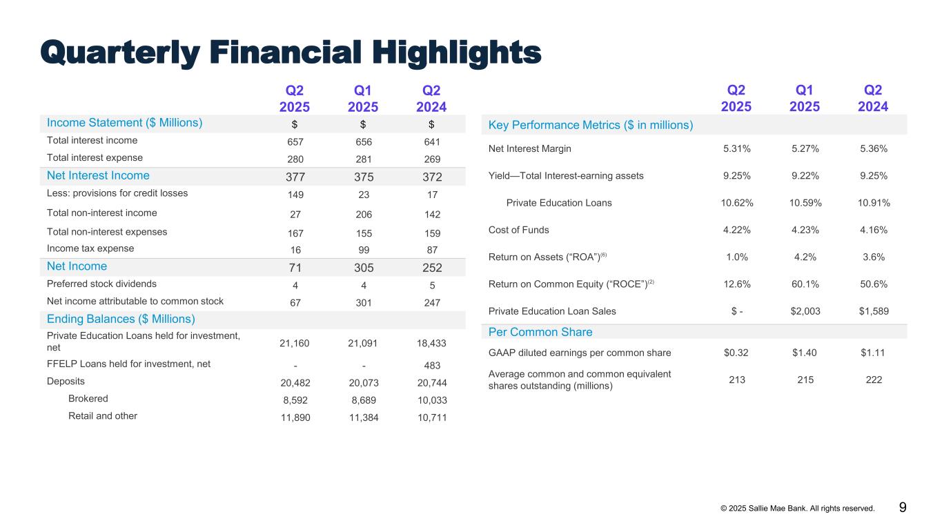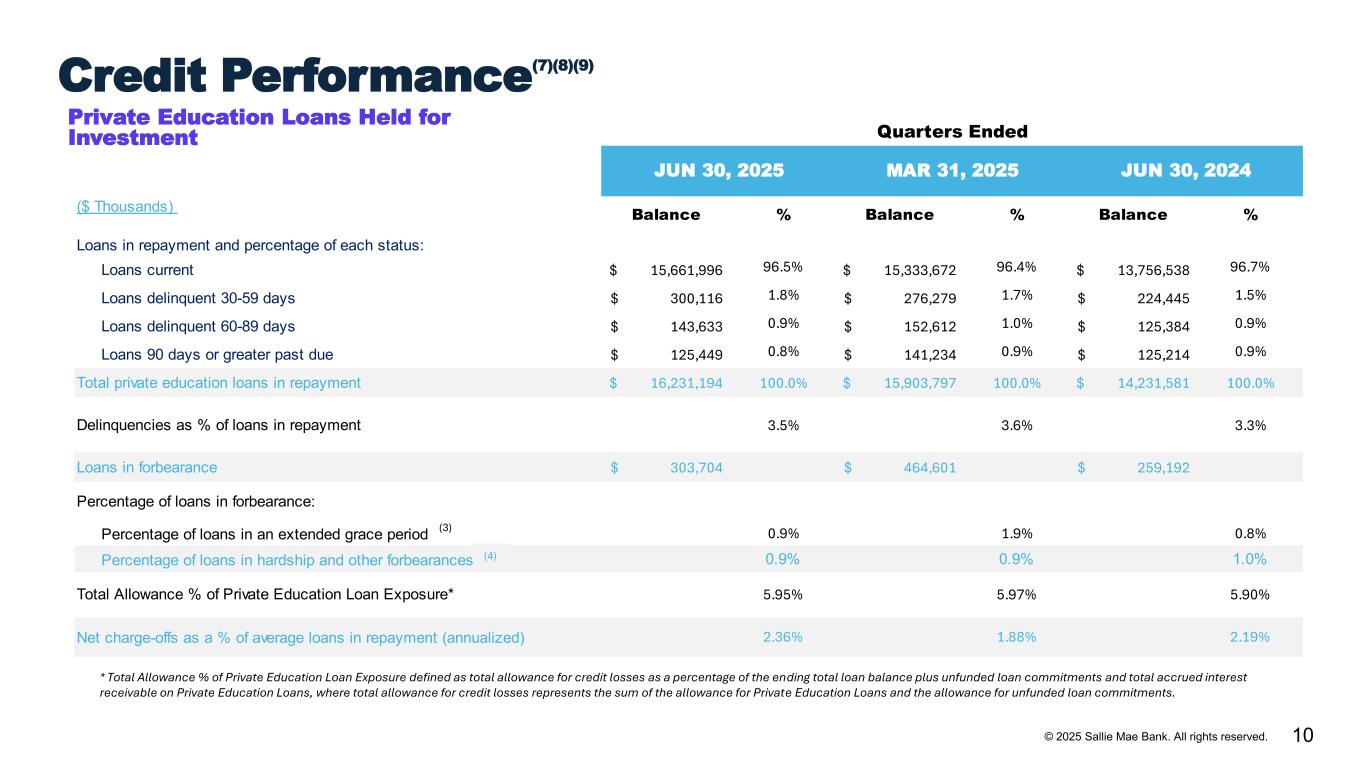 9© 2025 Sallie Mae Bank. All rights reserved. Q2 2025 Q1 2025 Q2 2024 Income Statement ($ Millions) Total interest income 657 656 641 Total interest expense 280 281 269 Net Interest Income 377 375 372 Less: provisions for credit losses 149 23 17 Total non-interest income 27 206 142 Total non-interest expenses 167 155 159 Income tax expense 16 99 87 Net Income 71 305 252 Preferred stock dividends 4 4 5 Net income attributable to common stock 67 301 247 Ending Balances ($ Millions) Private Education Loans held for investment, net 21,160 21,091 18,433 FFELP Loans held for investment, net - - 483 Deposits 20,482 20,073 20,744 Brokered 8,592 8,689 10,033 Retail and other 11,890 11,384 10,711 Q2 2025 Q1 2025 Q2 2024 Key Performance Metrics ($ in millions) Net Interest Margin 5.31% 5.27% 5.36% Yield—Total Interest-earning assets 9.25% 9.22% 9.25% Private Education Loans 10.62% 10.59% 10.91% Cost of Funds 4.22% 4.23% 4.16% Return on Assets (“ROA”)(6) 1.0% 4.2% 3.6% Return on Common Equity (“ROCE”)(2) 12.6% 60.1% 50.6% Private Education Loan Sales $ - $2,003 $1,589 Per Common Share GAAP diluted earnings per common share $0.32 $1.40 $1.11 Average common and common equivalent shares outstanding (millions) 213 215 222 Quarterly Financial Highlights
