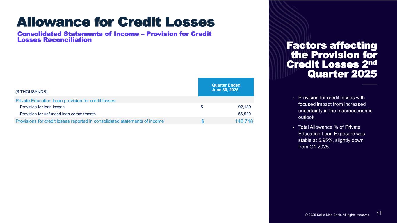 10© 2025 Sallie Mae Bank. All rights reserved. Credit Performance(7)(8)(9) Private Education Loans Held for Investment * Total Allowance % of Private Education Loan Exposure defined as total allowance for credit losses as a percentage of the ending total loan balance plus unfunded loan commitments and total accrued interest receivable on Private Education Loans, where total allowance for credit losses represents the sum of the allowance for Private Education Loans and the allowance for unfunded loan commitments. ($ Thousands) Balance % Balance % Balance % Loans in repayment and percentage of each status: Loans current 15,661,996$ 96.5% 15,333,672$ 96.4% 13,756,538$ 96.7% Loans delinquent 30-59 days 300,116$ 1.8% 276,279$ 1.7% 224,445$ 1.5% Loans delinquent 60-89 days 143,633$ 0.9% 152,612$ 1.0% 125,384$ 0.9% Loans 90 days or greater past due 125,449$ 0.8% 141,234$ 0.9% 125,214$ 0.9% Total private education loans in repayment 16,231,194$ 100.0% 15,903,797$ 100.0% 14,231,581$ 100.0% Delinquencies as % of loans in repayment 3.5% 3.6% 3.3% Loans in forbearance 303,704$ 464,601$ 259,192$ Percentage of loans in forbearance: Percentage of loans in an extended grace period(8) 0.9% 1.9% 0.8% Percentage of loans in hardship and other forbearances (9) 0.9% 0.9% 1.0% 5.95% 5.97% 5.90% Net charge-offs as a % of average loans in repayment (annualized) 2.36% 1.88% 2.19% Total Allowance % of Private Education Loan Exposure* JUN 30, 2024 Quarters Ended JUN 30, 2025 MAR 31, 2025 (3) (4)
