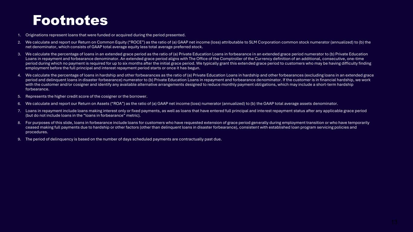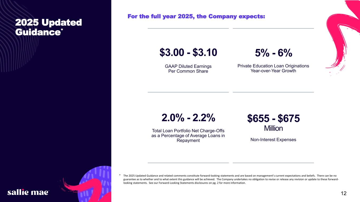 12 2025 Updated Guidance* For the full year 2025, the Company expects: $3.00 - $3.10 GAAP Diluted Earnings Per Common Share 5% - 6% Private Education Loan Originations Year-over-Year Growth 2.0% - 2.2% Total Loan Portfolio Net Charge-Offs as a Percentage of Average Loans in Repayment $655 - $675 Million Non-Interest Expenses * The 2025 Updated Guidance and related comments constitute forward-looking statements and are based on management’s current expectations and beliefs. There can be no guarantee as to whether and to what extent this guidance will be achieved. The Company undertakes no obligation to revise or release any revision or update to these forward- looking statements. See our Forward-Looking Statements disclosures on pg. 2 for more information.