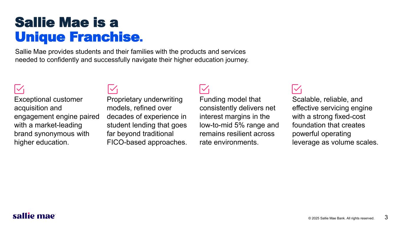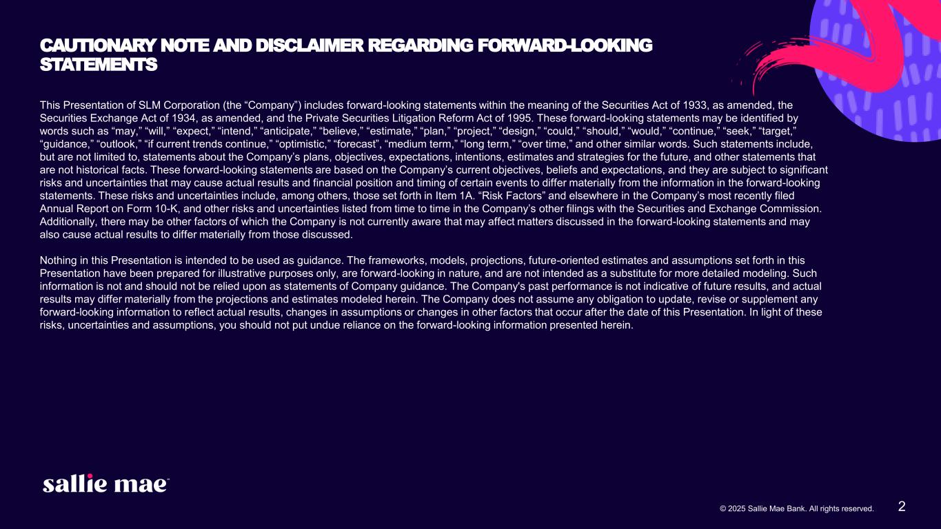 2 This Presentation of SLM Corporation (the “Company”) includes forward-looking statements within the meaning of the Securities Act of 1933, as amended, the Securities Exchange Act of 1934, as amended, and the Private Securities Litigation Reform Act of 1995. These forward-looking statements may be identified by words such as “may,” “will,” “expect,” “intend,” “anticipate,” “believe,” “estimate,” “plan,” “project,” “design,” “could,” “should,” “would,” “continue,” “seek,” “target,” “guidance,” “outlook,” “if current trends continue,” “optimistic,” “forecast”, “medium term,” “long term,” “over time,” and other similar words. Such statements include, but are not limited to, statements about the Company’s plans, objectives, expectations, intentions, estimates and strategies for the future, and other statements that are not historical facts. These forward-looking statements are based on the Company’s current objectives, beliefs and expectations, and they are subject to significant risks and uncertainties that may cause actual results and financial position and timing of certain events to differ materially from the information in the forward-looking statements. These risks and uncertainties include, among others, those set forth in Item 1A. “Risk Factors” and elsewhere in the Company’s most recently filed Annual Report on Form 10-K, and other risks and uncertainties listed from time to time in the Company’s other filings with the Securities and Exchange Commission. Additionally, there may be other factors of which the Company is not currently aware that may affect matters discussed in the forward-looking statements and may also cause actual results to differ materially from those discussed. Nothing in this Presentation is intended to be used as guidance. The frameworks, models, projections, future-oriented estimates and assumptions set forth in this Presentation have been prepared for illustrative purposes only, are forward-looking in nature, and are not intended as a substitute for more detailed modeling. Such information is not and should not be relied upon as statements of Company guidance. The Company's past performance is not indicative of future results, and actual results may differ materially from the projections and estimates modeled herein. The Company does not assume any obligation to update, revise or supplement any forward-looking information to reflect actual results, changes in assumptions or changes in other factors that occur after the date of this Presentation. In light of these risks, uncertainties and assumptions, you should not put undue reliance on the forward-looking information presented herein. © 2025 Sallie Mae Bank. All rights reserved. CAUTIONARY NOTE AND DISCLAIMER REGARDING FORWARD-LOOKING STATEMENTS