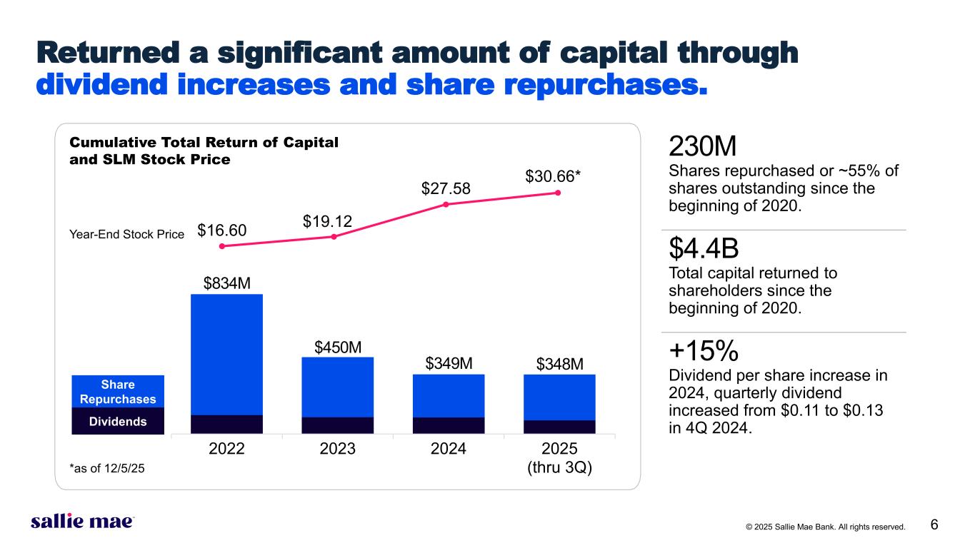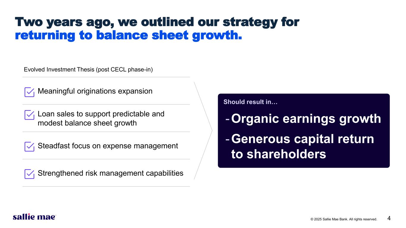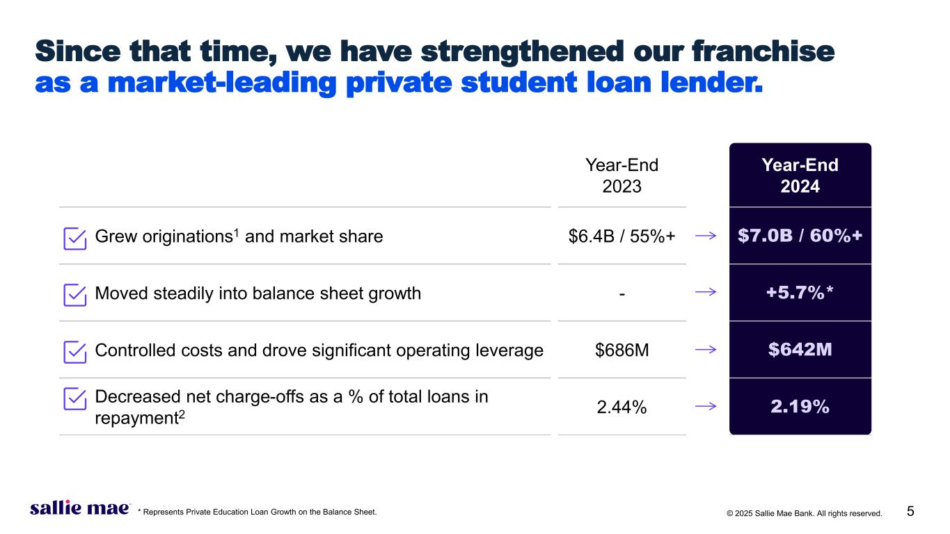 4© 2025 Sallie Mae Bank. All rights reserved. Should result in… -Organic earnings growth -Generous capital return to shareholders Meaningful originations expansion Loan sales to support predictable and modest balance sheet growth Steadfast focus on expense management Strengthened risk management capabilities Evolved Investment Thesis (post CECL phase-in) Two years ago, we outlined our strategy for returning to balance sheet growth.