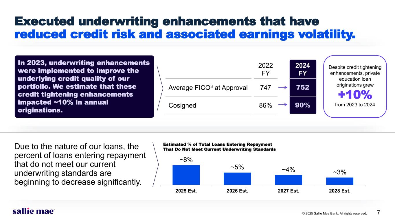 7© 2025 Sallie Mae Bank. All rights reserved. 2022 FY 2024 FY Average FICO3 at Approval 747 752 Cosigned 86% 90% Executed underwriting enhancements that have reduced credit risk and associated earnings volatility. In 2023, underwriting enhancements were implemented to improve the underlying credit quality of our portfolio. We estimate that these credit tightening enhancements impacted ~10% in annual originations. Despite credit tightening enhancements, private education loan originations grew +10% from 2023 to 2024 ~8% ~5% ~4% ~3% 2025 Est. 2026 Est. 2027 Est. 2028 Est. Due to the nature of our loans, the percent of loans entering repayment that do not meet our current underwriting standards are beginning to decrease significantly. Estimated % of Total Loans Entering Repayment That Do Not Meet Current Underwriting Standards