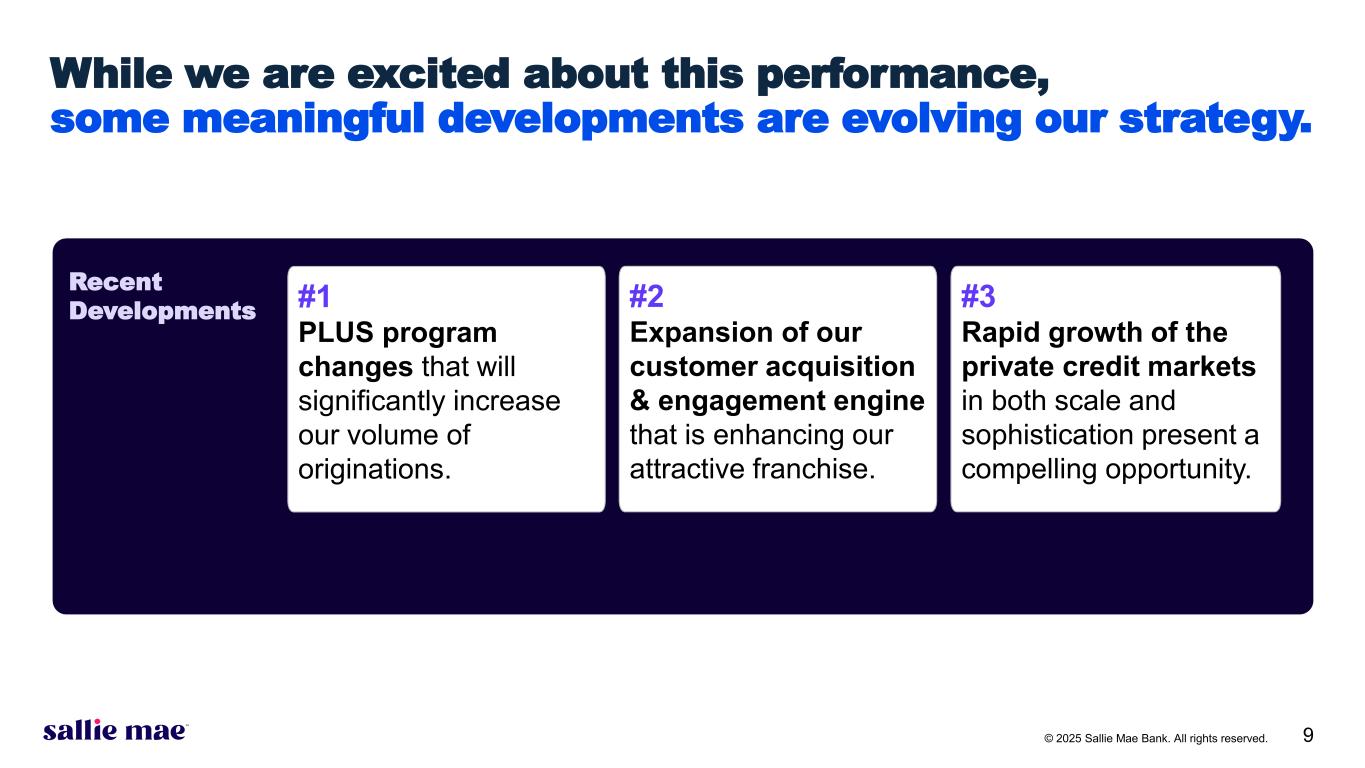 9© 2025 Sallie Mae Bank. All rights reserved. While we are excited about this performance, some meaningful developments are evolving our strategy. #1 PLUS program changes that will significantly increase our volume of originations. Recent Developments #2 Expansion of our customer acquisition & engagement engine that is enhancing our attractive franchise. #3 Rapid growth of the private credit markets in both scale and sophistication present a compelling opportunity.