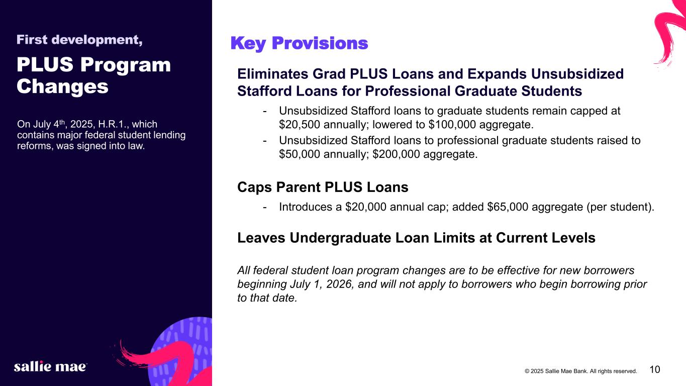 10© 2025 Sallie Mae Bank. All rights reserved. First development, PLUS Program Changes On July 4th, 2025, H.R.1., which contains major federal student lending reforms, was signed into law. Eliminates Grad PLUS Loans and Expands Unsubsidized Stafford Loans for Professional Graduate Students - Unsubsidized Stafford loans to graduate students remain capped at $20,500 annually; lowered to $100,000 aggregate. - Unsubsidized Stafford loans to professional graduate students raised to $50,000 annually; $200,000 aggregate. Caps Parent PLUS Loans - Introduces a $20,000 annual cap; added $65,000 aggregate (per student). Leaves Undergraduate Loan Limits at Current Levels All federal student loan program changes are to be effective for new borrowers beginning July 1, 2026, and will not apply to borrowers who begin borrowing prior to that date. Key Provisions