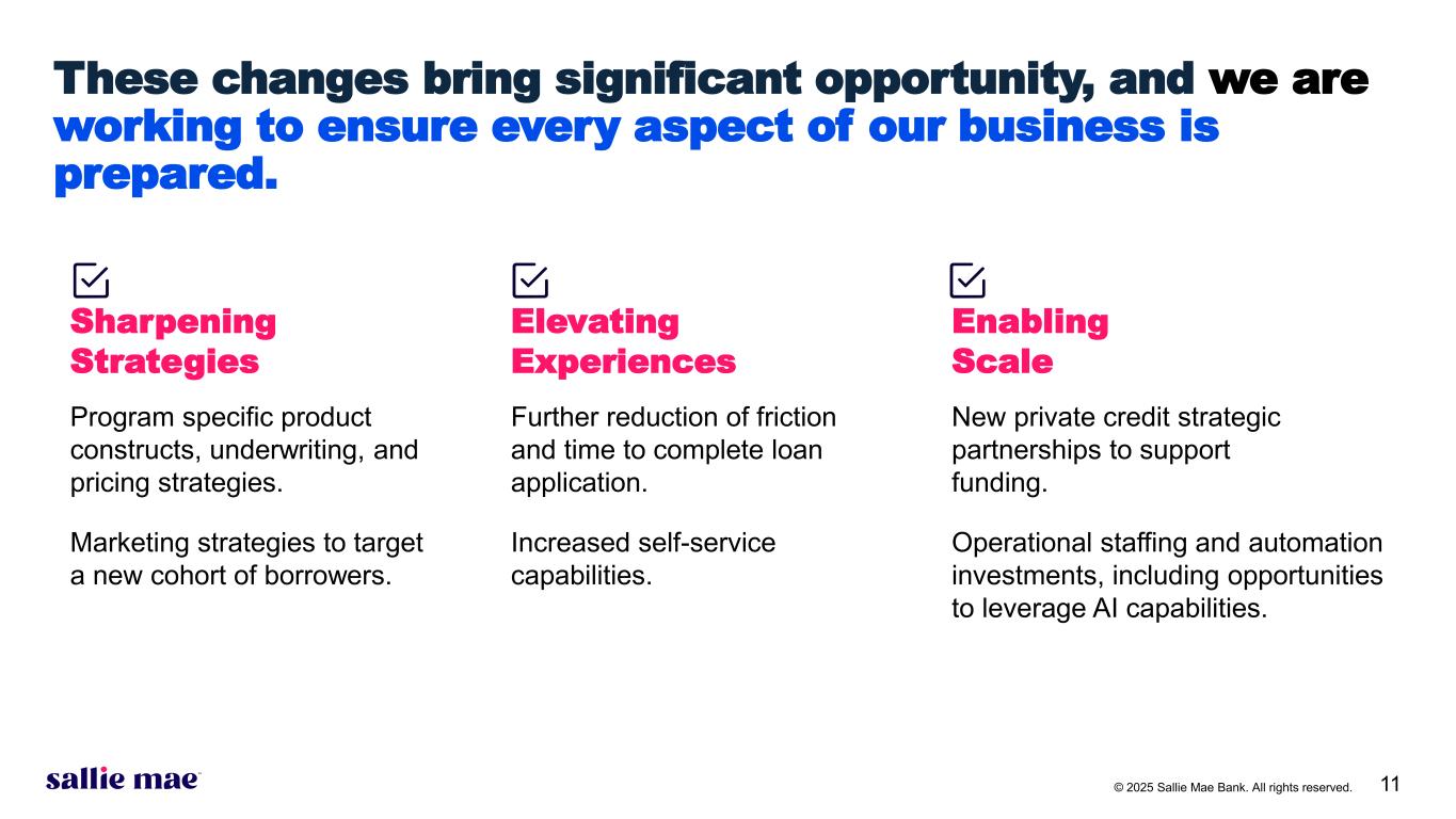 11© 2025 Sallie Mae Bank. All rights reserved. These changes bring significant opportunity, and we are working to ensure every aspect of our business is prepared. Sharpening Strategies Program specific product constructs, underwriting, and pricing strategies. Marketing strategies to target a new cohort of borrowers. Elevating Experiences Further reduction of friction and time to complete loan application. Increased self-service capabilities. Enabling Scale New private credit strategic partnerships to support funding. Operational staffing and automation investments, including opportunities to leverage AI capabilities.