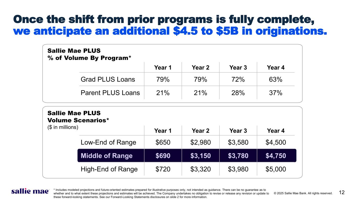 12© 2025 Sallie Mae Bank. All rights reserved. Year 1 Year 2 Year 3 Year 4 Low-End of Range $650 $2,980 $3,580 $4,500 Middle of Range $690 $3,150 $3,780 $4,750 High-End of Range $720 $3,320 $3,980 $5,000 Year 1 Year 2 Year 3 Year 4 Grad PLUS Loans 79% 79% 72% 63% Parent PLUS Loans 21% 21% 28% 37% Once the shift from prior programs is fully complete, we anticipate an additional $4.5 to $5B in originations. Sallie Mae PLUS % of Volume By Program* Sallie Mae PLUS Volume Scenarios* ($ in millions) * Includes modeled projections and future-oriented estimates prepared for illustrative purposes only, not intended as guidance. There can be no guarantee as to whether and to what extent these projections and estimates will be achieved. The Company undertakes no obligation to revise or release any revision or update to these forward-looking statements. See our Forward-Looking Statements disclosures on slide 2 for more information.