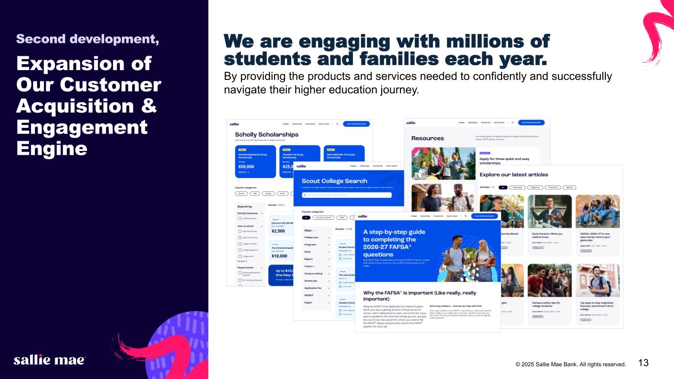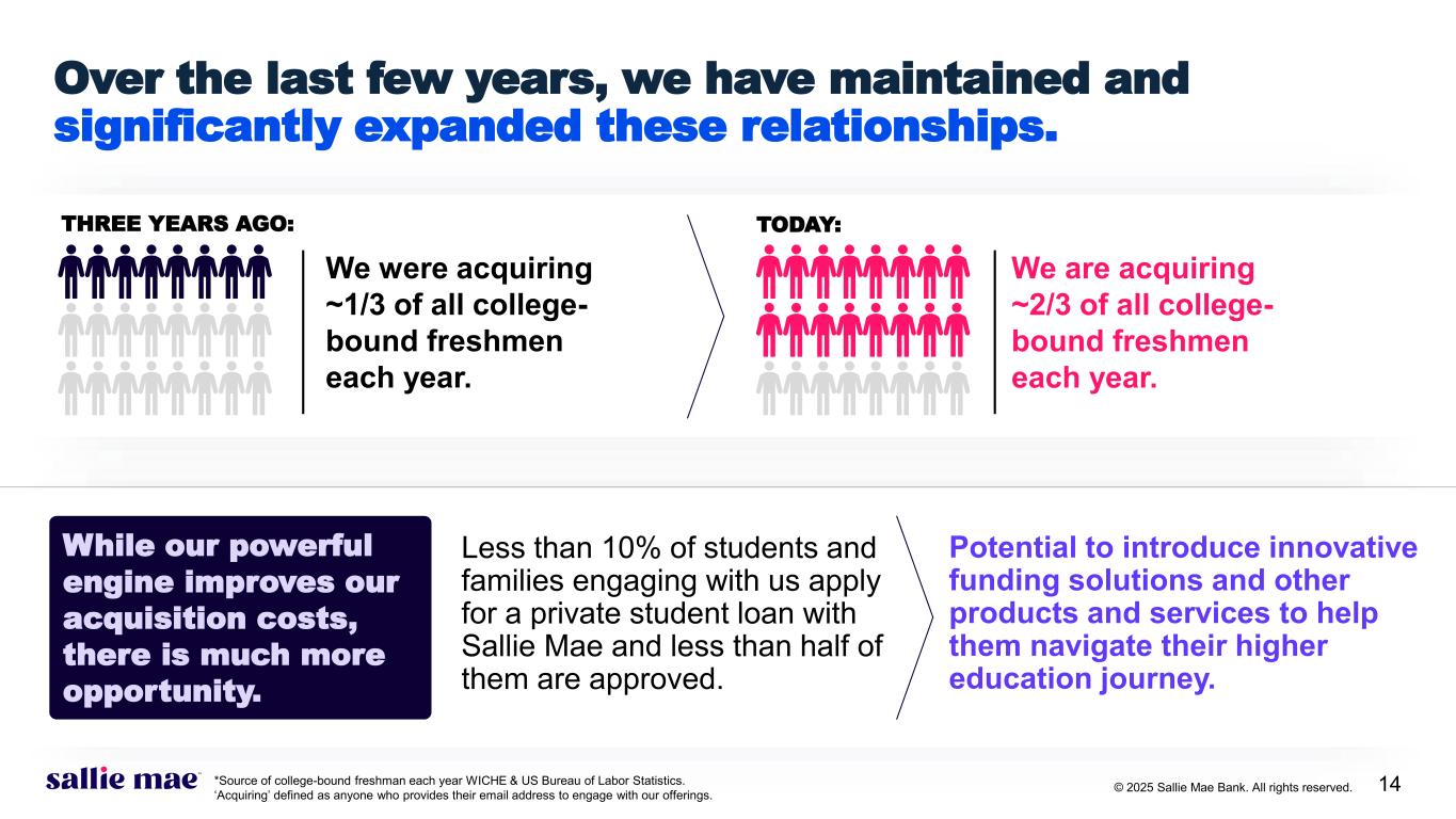 13© 2025 Sallie Mae Bank. All rights reserved. Second development, Expansion of Our Customer Acquisition & Engagement Engine By providing the products and services needed to confidently and successfully navigate their higher education journey. We are engaging with millions of students and families each year.
