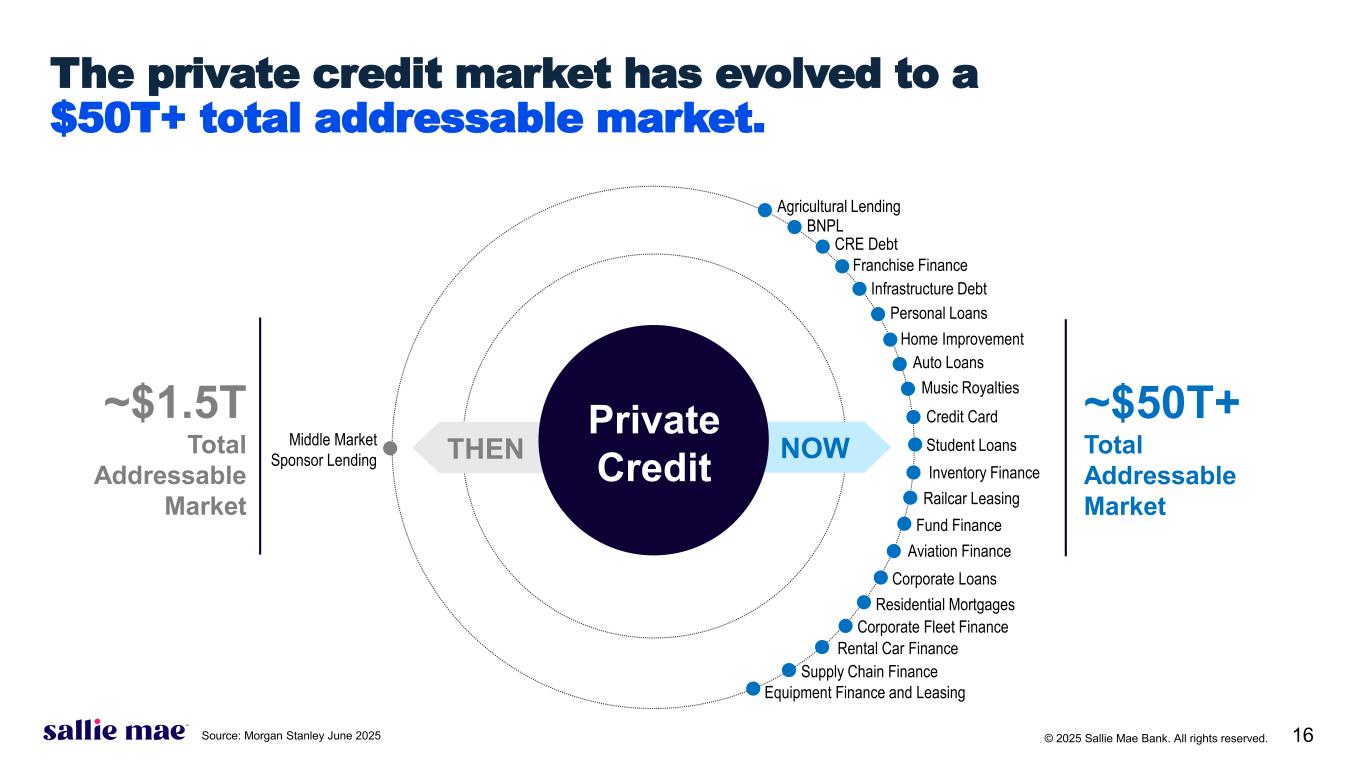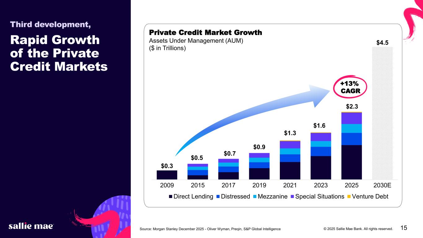 15© 2025 Sallie Mae Bank. All rights reserved. Third development, Rapid Growth of the Private Credit Markets Private Credit Market Growth Assets Under Management (AUM) ($ in Trillions) $0.3 $0.5 $0.7 $0.9 $1.3 $1.6 $2.3 $4.5 2009 2015 2017 2019 2021 2023 2025 2030E Direct Lending Distressed Mezzanine Special Situations Venture Debt +13% CAGR Source: Morgan Stanley December 2025 - Oliver Wyman, Preqin, S&P Global Intelligence