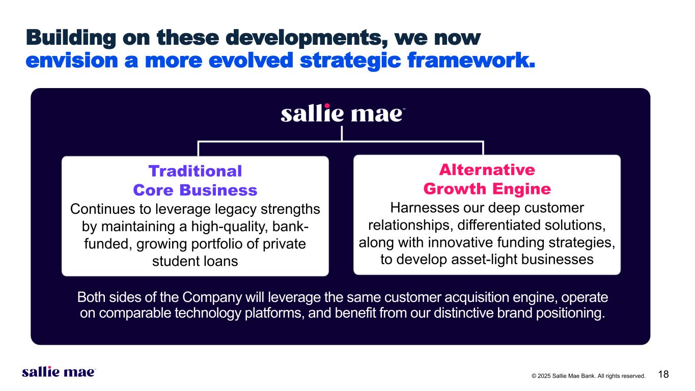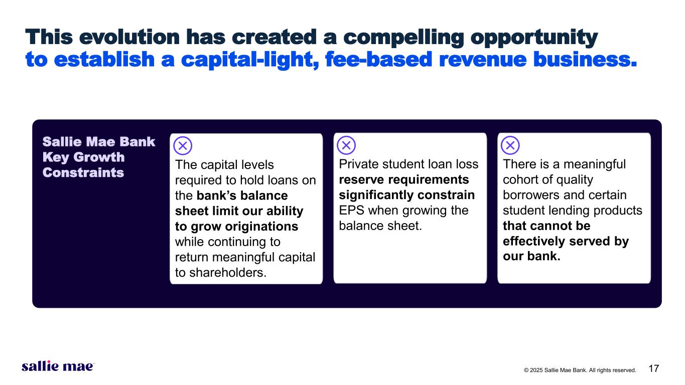 17© 2025 Sallie Mae Bank. All rights reserved. This evolution has created a compelling opportunity to establish a capital-light, fee-based revenue business. The capital levels required to hold loans on the bank’s balance sheet limit our ability to grow originations while continuing to return meaningful capital to shareholders. Sallie Mae Bank Key Growth Constraints Private student loan loss reserve requirements significantly constrain EPS when growing the balance sheet. There is a meaningful cohort of quality borrowers and certain student lending products that cannot be effectively served by our bank.