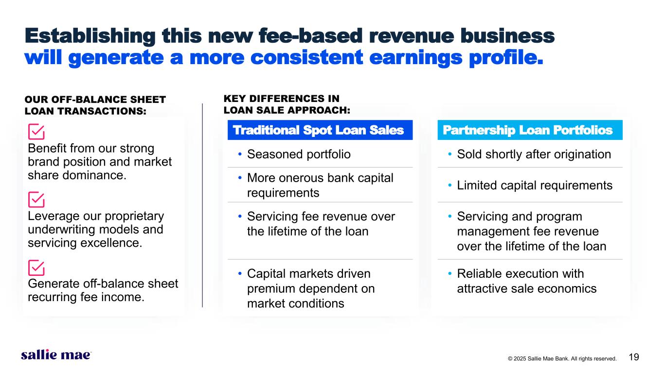 18© 2025 Sallie Mae Bank. All rights reserved. Both sides of the Company will leverage the same customer acquisition engine, operate on comparable technology platforms, and benefit from our distinctive brand positioning. Building on these developments, we now envision a more evolved strategic framework. Traditional Core Business Continues to leverage legacy strengths by maintaining a high-quality, bank- funded, growing portfolio of private student loans Alternative Growth Engine Harnesses our deep customer relationships, differentiated solutions, along with innovative funding strategies, to develop asset-light businesses