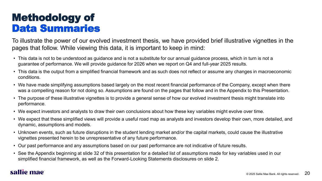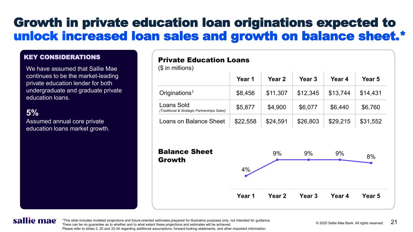 20© 2025 Sallie Mae Bank. All rights reserved. Methodology of Data Summaries To illustrate the power of our evolved investment thesis, we have provided brief illustrative vignettes in the pages that follow. While viewing this data, it is important to keep in mind: • This data is not to be understood as guidance and is not a substitute for our annual guidance process, which in turn is not a guarantee of performance. We will provide guidance for 2026 when we report on Q4 and full-year 2025 results. • This data is the output from a simplified financial framework and as such does not reflect or assume any changes in macroeconomic conditions. • We have made simplifying assumptions based largely on the most recent financial performance of the Company, except when there was a compelling reason for not doing so. Assumptions are found on the pages that follow and in the Appendix to this Presentation. • The purpose of these illustrative vignettes is to provide a general sense of how our evolved investment thesis might translate into performance. • We expect investors and analysts to draw their own conclusions about how these key variables might evolve over time. • We expect that these simplified views will provide a useful road map as analysts and investors develop their own, more detailed, and dynamic, assumptions and models. • Unknown events, such as future disruptions in the student lending market and/or the capital markets, could cause the illustrative vignettes presented herein to be unrepresentative of any future performance. • Our past performance and any assumptions based on our past performance are not indicative of future results. • See the Appendix beginning at slide 32 of this presentation for a detailed list of assumptions made for key variables used in our simplified financial framework, as well as the Forward-Looking Statements disclosures on slide 2.