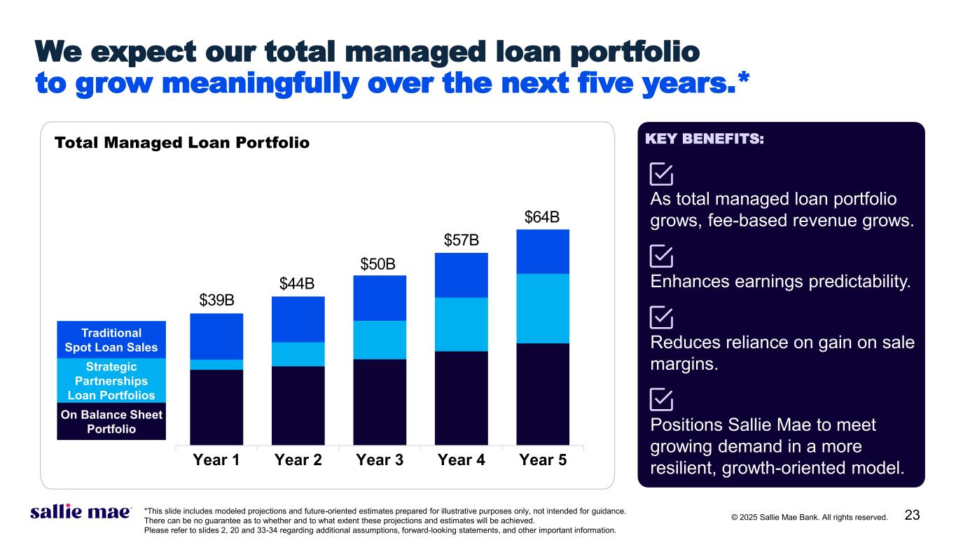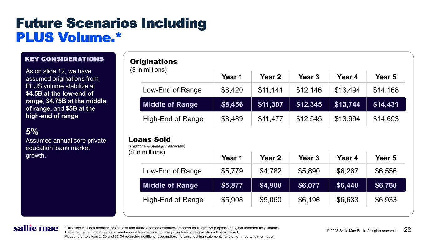 22© 2025 Sallie Mae Bank. All rights reserved. Originations ($ in millions)As on slide 12, we have assumed originations from PLUS volume stabilize at $4.5B at the low-end of range, $4.75B at the middle of range, and $5B at the high-end of range. 5% Assumed annual core private education loans market growth. KEY CONSIDERATIONS Year 1 Year 2 Year 3 Year 4 Year 5 Low-End of Range $8,420 $11,141 $12,146 $13,494 $14,168 Middle of Range $8,456 $11,307 $12,345 $13,744 $14,431 High-End of Range $8,489 $11,477 $12,545 $13,994 $14,693 Loans Sold (Traditional & Strategic Partnership) ($ in millions) Year 1 Year 2 Year 3 Year 4 Year 5 Low-End of Range $5,779 $4,782 $5,890 $6,267 $6,556 Middle of Range $5,877 $4,900 $6,077 $6,440 $6,760 High-End of Range $5,908 $5,060 $6,196 $6,633 $6,933 Future Scenarios Including PLUS Volume.* *This slide includes modeled projections and future-oriented estimates prepared for illustrative purposes only, not intended for guidance. There can be no guarantee as to whether and to what extent these projections and estimates will be achieved. Please refer to slides 2, 20 and 33-34 regarding additional assumptions, forward-looking statements, and other important information.