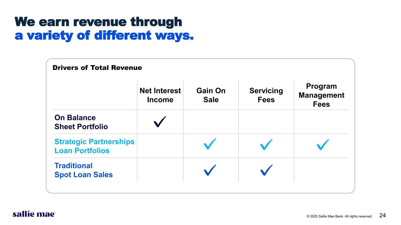 24© 2025 Sallie Mae Bank. All rights reserved. Net Interest Income Gain On Sale Servicing Fees Program Management Fees On Balance Sheet Portfolio Strategic Partnerships Loan Portfolios Traditional Spot Loan Sales We earn revenue through a variety of different ways. Drivers of Total Revenue