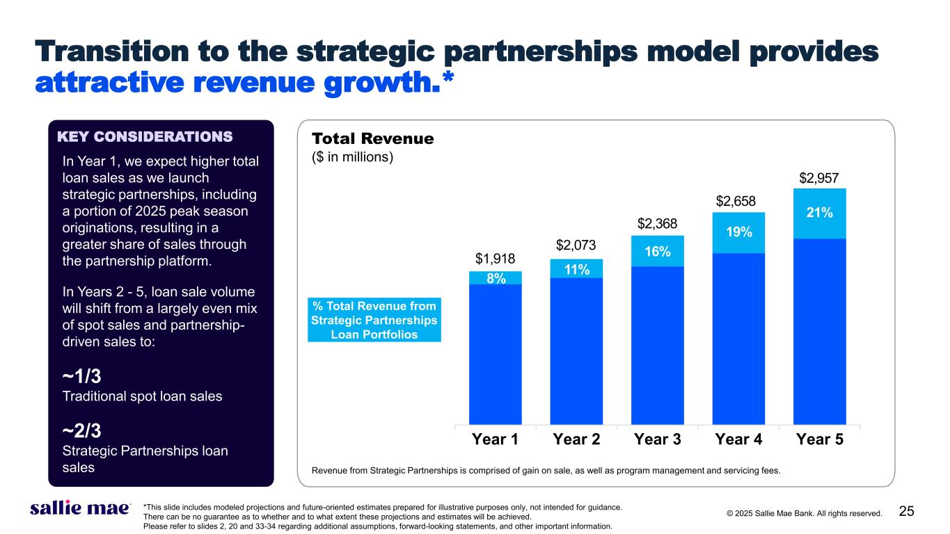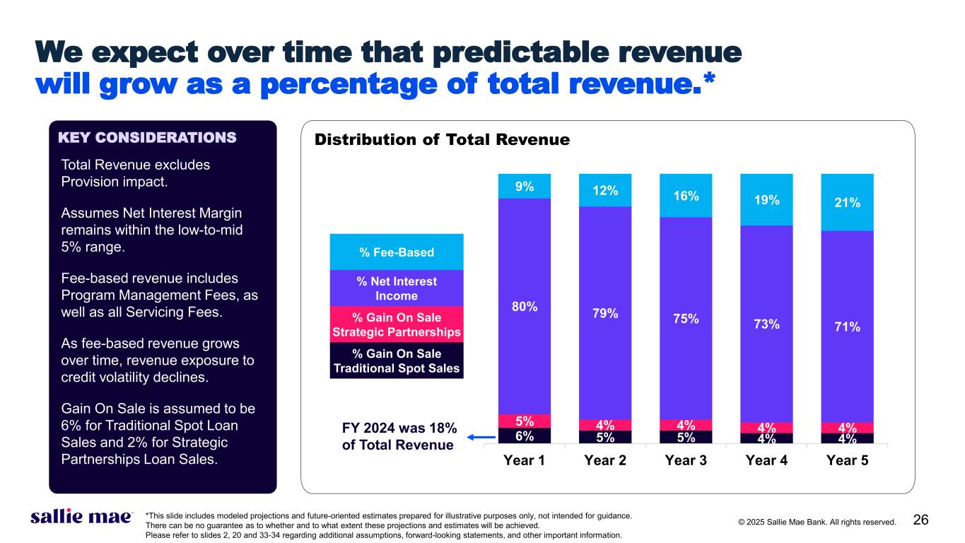 25© 2025 Sallie Mae Bank. All rights reserved. In Year 1, we expect higher total loan sales as we launch strategic partnerships, including a portion of 2025 peak season originations, resulting in a greater share of sales through the partnership platform. In Years 2 - 5, loan sale volume will shift from a largely even mix of spot sales and partnership- driven sales to: ~1/3 Traditional spot loan sales ~2/3 Strategic Partnerships loan sales KEY CONSIDERATIONS Total Revenue ($ in millions) Transition to the strategic partnerships model provides attractive revenue growth.* Year 1 Year 2 Year 3 Year 4 Year 5 $1,918 $2,073 $2,368 $2,658 $2,957 % Total Revenue from Strategic Partnerships Loan Portfolios 8% 11% 16% 19% 21% Revenue from Strategic Partnerships is comprised of gain on sale, as well as program management and servicing fees. *This slide includes modeled projections and future-oriented estimates prepared for illustrative purposes only, not intended for guidance. There can be no guarantee as to whether and to what extent these projections and estimates will be achieved. Please refer to slides 2, 20 and 33-34 regarding additional assumptions, forward-looking statements, and other important information.