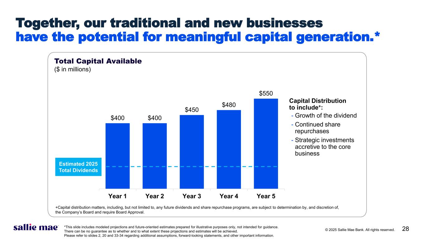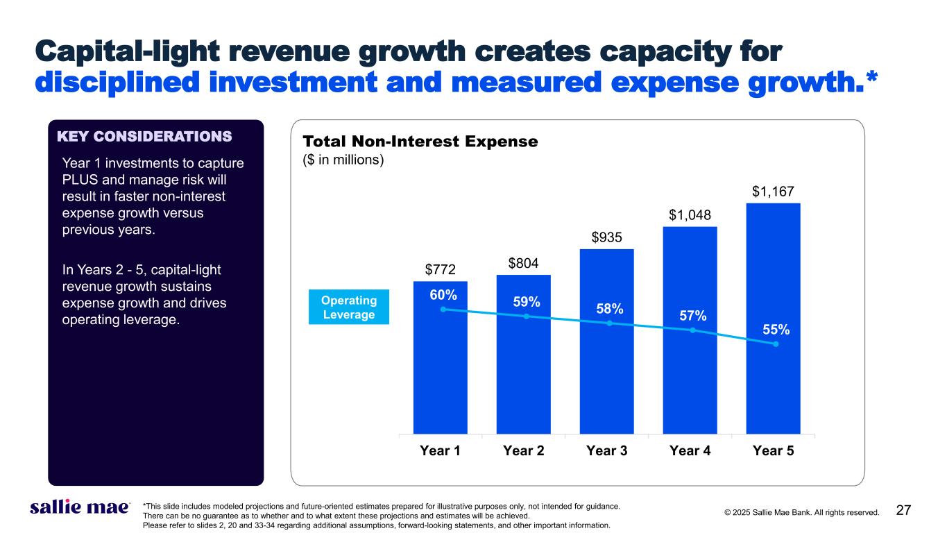 27© 2025 Sallie Mae Bank. All rights reserved. Capital-light revenue growth creates capacity for disciplined investment and measured expense growth.* $772 $804 $935 $1,048 $1,167 Year 1 Year 2 Year 3 Year 4 Year 5 60% 59% 58% 57% 55% Year 1 investments to capture PLUS and manage risk will result in faster non-interest expense growth versus previous years. In Years 2 - 5, capital-light revenue growth sustains expense growth and drives operating leverage. KEY CONSIDERATIONS Total Non-Interest Expense ($ in millions) Operating Leverage *This slide includes modeled projections and future-oriented estimates prepared for illustrative purposes only, not intended for guidance. There can be no guarantee as to whether and to what extent these projections and estimates will be achieved. Please refer to slides 2, 20 and 33-34 regarding additional assumptions, forward-looking statements, and other important information.