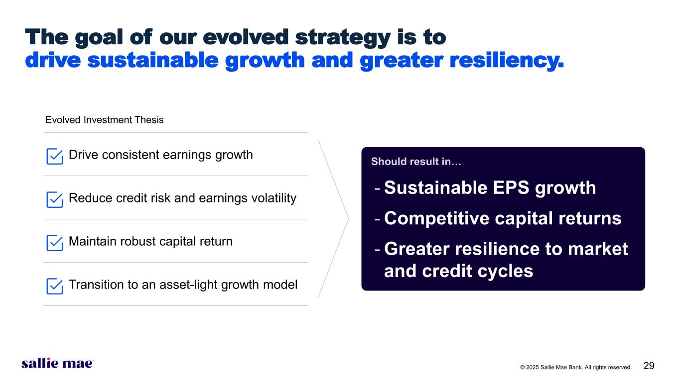 29© 2025 Sallie Mae Bank. All rights reserved. Drive consistent earnings growth Reduce credit risk and earnings volatility Maintain robust capital return Transition to an asset-light growth model Should result in… - Sustainable EPS growth - Competitive capital returns - Greater resilience to market and credit cycles Evolved Investment Thesis The goal of our evolved strategy is to drive sustainable growth and greater resiliency.