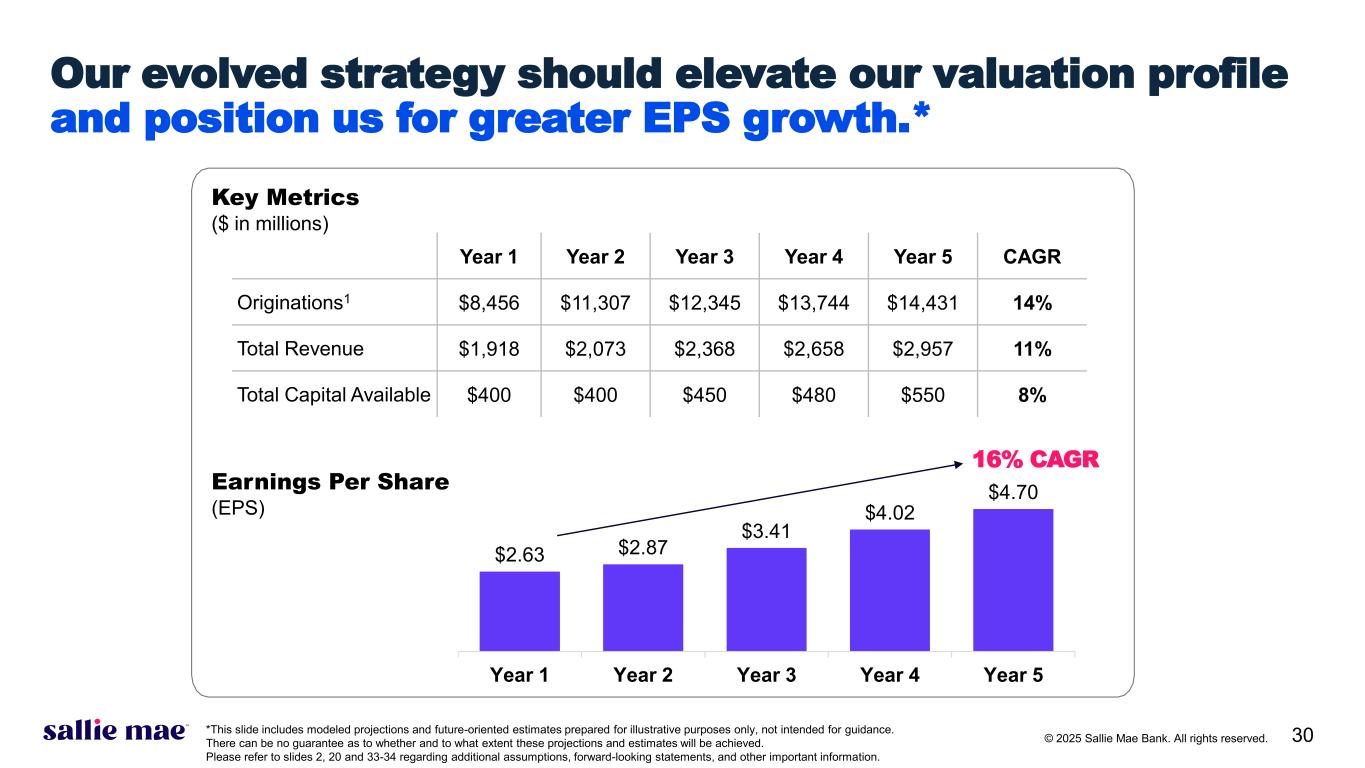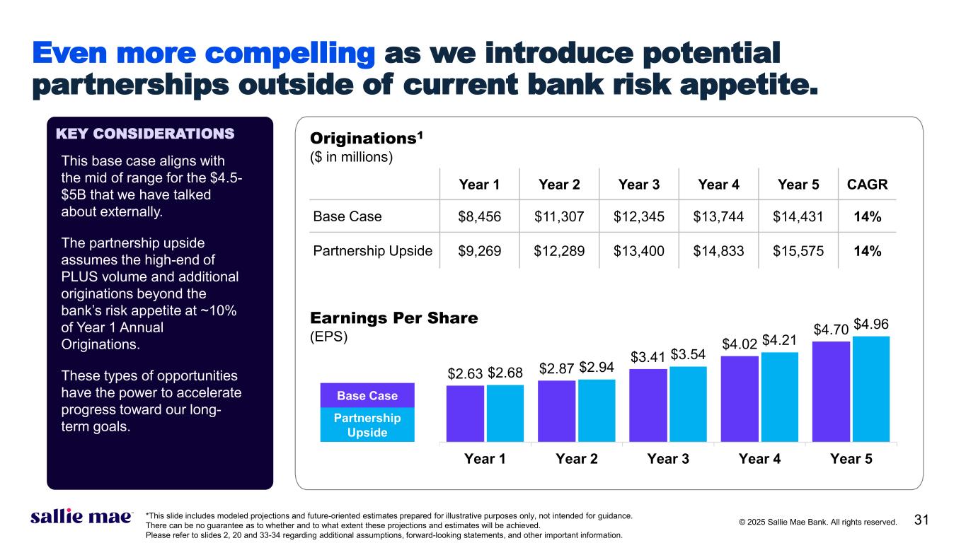 30© 2025 Sallie Mae Bank. All rights reserved. Year 1 Year 2 Year 3 Year 4 Year 5 CAGR Originations1 $8,456 $11,307 $12,345 $13,744 $14,431 14% Total Revenue $1,918 $2,073 $2,368 $2,658 $2,957 11% Total Capital Available $400 $400 $450 $480 $550 8% Key Metrics ($ in millions) $2.63 $2.87 $3.41 $4.02 $4.70 Year 1 Year 2 Year 3 Year 4 Year 5 16% CAGR Our evolved strategy should elevate our valuation profile and position us for greater EPS growth.* *This slide includes modeled projections and future-oriented estimates prepared for illustrative purposes only, not intended for guidance. There can be no guarantee as to whether and to what extent these projections and estimates will be achieved. Please refer to slides 2, 20 and 33-34 regarding additional assumptions, forward-looking statements, and other important information. Earnings Per Share (EPS)