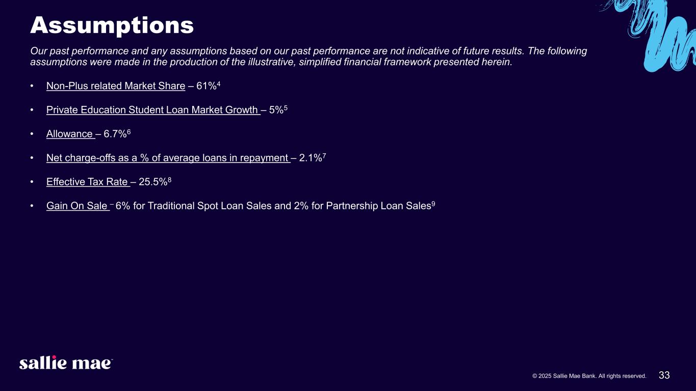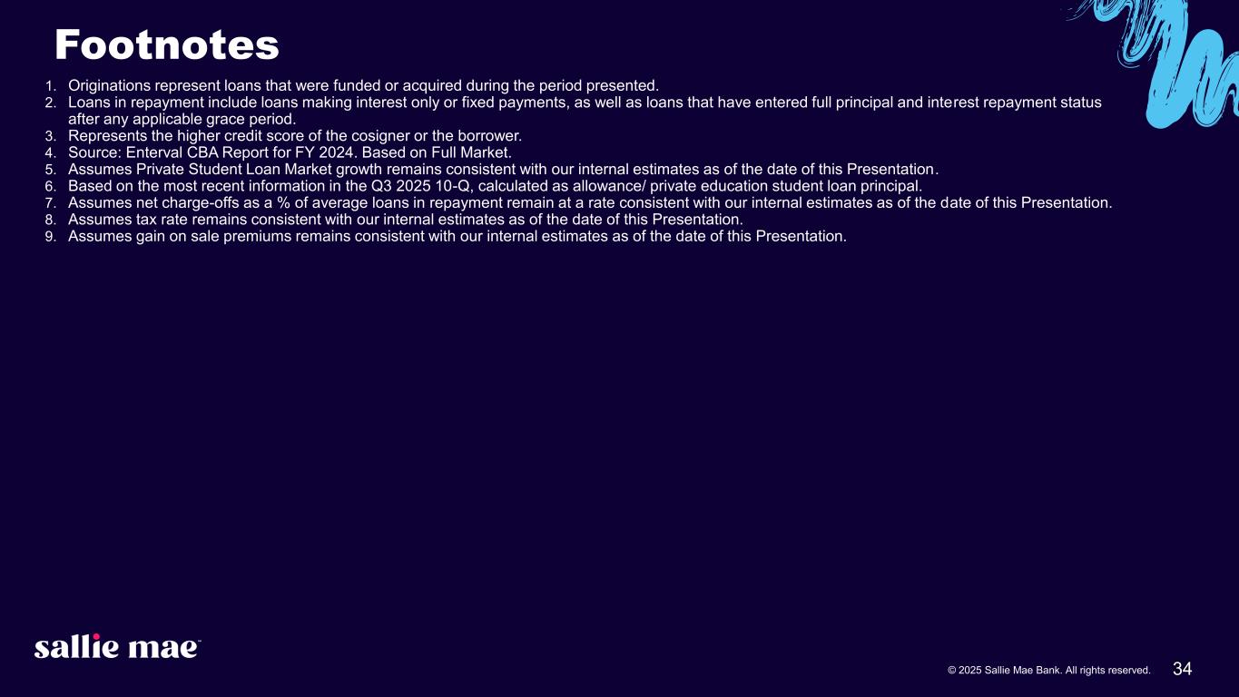 33© 2025 Sallie Mae Bank. All rights reserved. Our past performance and any assumptions based on our past performance are not indicative of future results. The following assumptions were made in the production of the illustrative, simplified financial framework presented herein. • Non-Plus related Market Share – 61%4 • Private Education Student Loan Market Growth – 5%5 • Allowance – 6.7%6 • Net charge-offs as a % of average loans in repayment – 2.1%7 • Effective Tax Rate – 25.5%8 • Gain On Sale – 6% for Traditional Spot Loan Sales and 2% for Partnership Loan Sales9 Assumptions