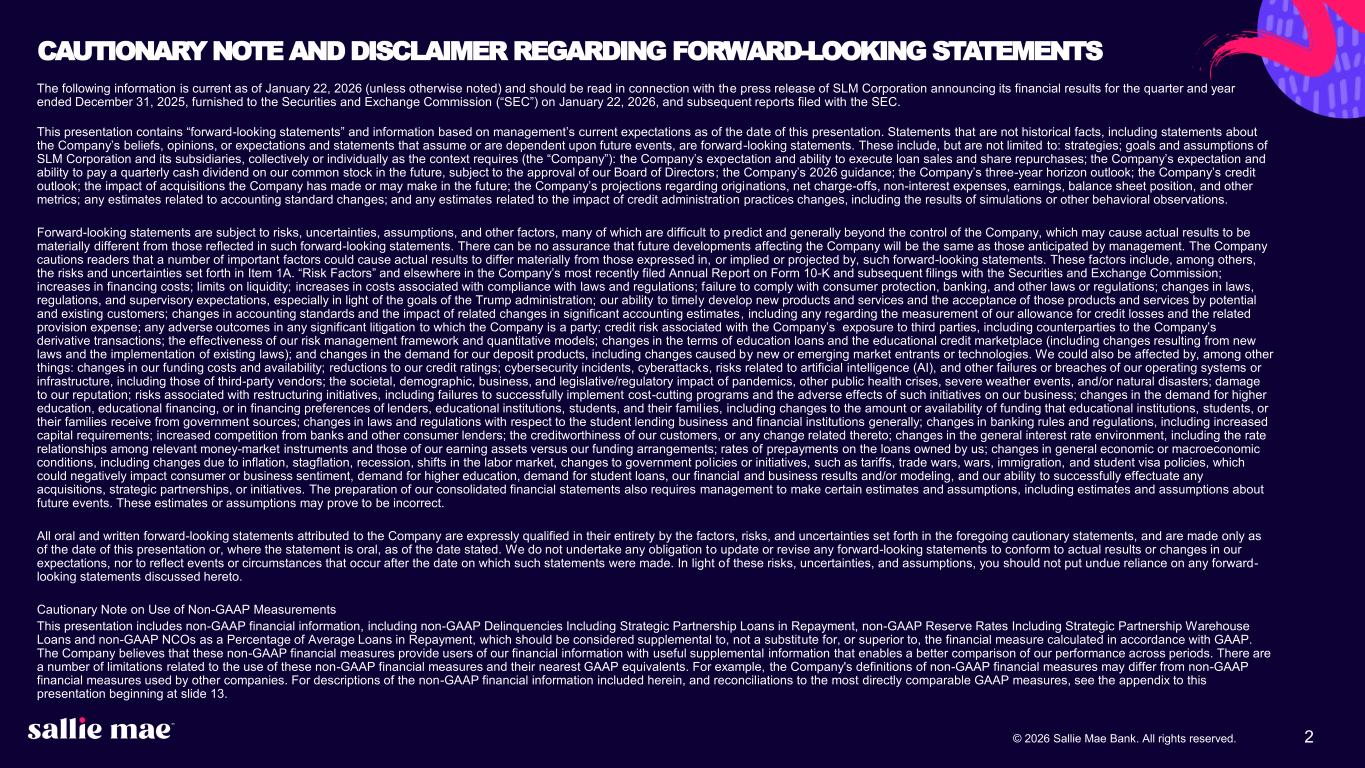 2© 2026 Sallie Mae Bank. All rights reserved. The following information is current as of January 22, 2026 (unless otherwise noted) and should be read in connection with the press release of SLM Corporation announcing its financial results for the quarter and year ended December 31, 2025, furnished to the Securities and Exchange Commission (“SEC”) on January 22, 2026, and subsequent reports filed with the SEC. This presentation contains “forward-looking statements” and information based on management’s current expectations as of the date of this presentation. Statements that are not historical facts, including statements about the Company’s beliefs, opinions, or expectations and statements that assume or are dependent upon future events, are forward-looking statements. These include, but are not limited to: strategies; goals and assumptions of SLM Corporation and its subsidiaries, collectively or individually as the context requires (the “Company”): the Company’s expectation and ability to execute loan sales and share repurchases; the Company’s expectation and ability to pay a quarterly cash dividend on our common stock in the future, subject to the approval of our Board of Directors; the Company’s 2026 guidance; the Company’s three-year horizon outlook; the Company’s credit outlook; the impact of acquisitions the Company has made or may make in the future; the Company’s projections regarding originations, net charge-offs, non-interest expenses, earnings, balance sheet position, and other metrics; any estimates related to accounting standard changes; and any estimates related to the impact of credit administration practices changes, including the results of simulations or other behavioral observations. Forward-looking statements are subject to risks, uncertainties, assumptions, and other factors, many of which are difficult to predict and generally beyond the control of the Company, which may cause actual results to be materially different from those reflected in such forward-looking statements. There can be no assurance that future developments affecting the Company will be the same as those anticipated by management. The Company cautions readers that a number of important factors could cause actual results to differ materially from those expressed in, or implied or projected by, such forward-looking statements. These factors include, among others, the risks and uncertainties set forth in Item 1A. “Risk Factors” and elsewhere in the Company’s most recently filed Annual Report on Form 10-K and subsequent filings with the Securities and Exchange Commission; increases in financing costs; limits on liquidity; increases in costs associated with compliance with laws and regulations; failure to comply with consumer protection, banking, and other laws or regulations; changes in laws, regulations, and supervisory expectations, especially in light of the goals of the Trump administration; our ability to timely develop new products and services and the acceptance of those products and services by potential and existing customers; changes in accounting standards and the impact of related changes in significant accounting estimates, including any regarding the measurement of our allowance for credit losses and the related provision expense; any adverse outcomes in any significant litigation to which the Company is a party; credit risk associated with the Company’s exposure to third parties, including counterparties to the Company’s derivative transactions; the effectiveness of our risk management framework and quantitative models; changes in the terms of education loans and the educational credit marketplace (including changes resulting from new laws and the implementation of existing laws); and changes in the demand for our deposit products, including changes caused by new or emerging market entrants or technologies. We could also be affected by, among other things: changes in our funding costs and availability; reductions to our credit ratings; cybersecurity incidents, cyberattacks, risks related to artificial intelligence (AI), and other failures or breaches of our operating systems or infrastructure, including those of third-party vendors; the societal, demographic, business, and legislative/regulatory impact of pandemics, other public health crises, severe weather events, and/or natural disasters; damage to our reputation; risks associated with restructuring initiatives, including failures to successfully implement cost-cutting programs and the adverse effects of such initiatives on our business; changes in the demand for higher education, educational financing, or in financing preferences of lenders, educational institutions, students, and their famil ies, including changes to the amount or availability of funding that educational institutions, students, or their families receive from government sources; changes in laws and regulations with respect to the student lending business and financial institutions generally; changes in banking rules and regulations, including increased capital requirements; increased competition from banks and other consumer lenders; the creditworthiness of our customers, or any change related thereto; changes in the general interest rate environment, including the rate relationships among relevant money-market instruments and those of our earning assets versus our funding arrangements; rates of prepayments on the loans owned by us; changes in general economic or macroeconomic conditions, including changes due to inflation, stagflation, recession, shifts in the labor market, changes to government policies or initiatives, such as tariffs, trade wars, wars, immigration, and student visa policies, which could negatively impact consumer or business sentiment, demand for higher education, demand for student loans, our financial and business results and/or modeling, and our ability to successfully effectuate any acquisitions, strategic 