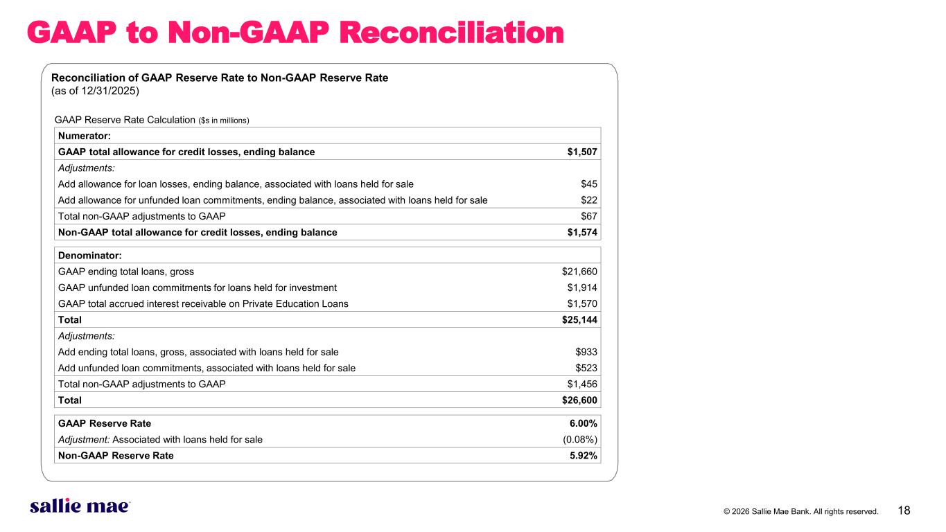 17© 2026 Sallie Mae Bank. All rights reserved. Evolved Strategy Impact On Ratios Delinquency Rate Delinquency Rate Total Delinquencies ($M) Total Private Education Loans in Repayment ($M) GAAP Delinquency Rate (Excluding Strategic Partnership Loans in Repayment) A 4.00% $636 $15,895 Non-GAAP Delinquency Rate (Including Strategic Partnership Loans in Repayment) B 3.88% $638 $16,429 Delinquency Rate(9) (as of 12/31/2025) RATIO IMPACT When adjusted to include the loans to be sold to the Strategic Partnership and therefore classified as held-for-sale at year-end that are in repayment, the delinquency rate declines 12 basis points. This is the mechanical result of the denominator of the calculation changing while the numerator remains largely unchanged. A We calculate and report our GAAP Delinquency Rate (Excluding Strategic Partnership Loans in Repayment) as the ratio of (a) total GAAP delinquent loans greater than 30 days numerator to (b) total GAAP loans in repayment denominator. B We calculate and report our Non-GAAP Delinquency Rate (Including Strategic Partnership Loans in Repayment) as the ratio of (a) total GAAP delinquent loans greater than 30 days plus delinquent loans greater than 30 days associated with loans held for sale numerator to (b) total GAAP loans in repayment plus total loans in repayment associated with loans held for sale denominator. A reconciliation of this and other non-GAAP to GAAP measures is included in this appendix on slides 18 and 19.