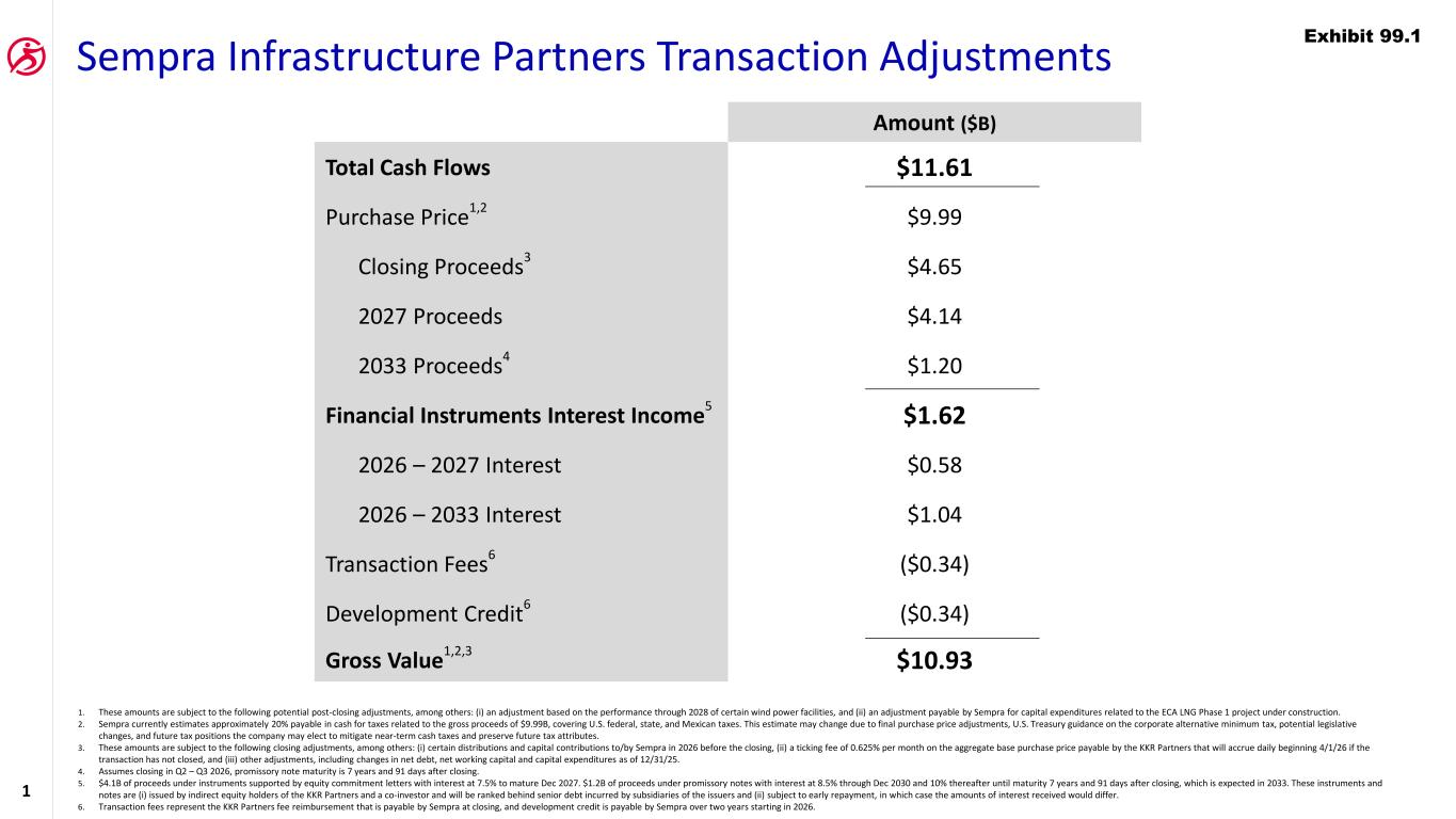 1 Sempra Infrastructure Partners Transaction Adjustments Amount ($B) Total Cash Flows $11.61 Purchase Price1,2 $9.99 Closing Proceeds3 $4.65 2027 Proceeds $4.14 2033 Proceeds4 $1.20 Financial Instruments Interest Income5 $1.62 2026 – 2027 Interest $0.58 2026 – 2033 Interest $1.04 Transaction Fees6 ($0.34) Development Credit6 ($0.34) Gross Value1,2,3 $10.93 1. These amounts are subject to the following potential post-closing adjustments, among others: (i) an adjustment based on the performance through 2028 of certain wind power facilities, and (ii) an adjustment payable by Sempra for capital expenditures related to the ECA LNG Phase 1 project under construction. 2. Sempra currently estimates approximately 20% payable in cash for taxes related to the gross proceeds of $9.99B, covering U.S. federal, state, and Mexican taxes. This estimate may change due to final purchase price adjustments, U.S. Treasury guidance on the corporate alternative minimum tax, potential legislative changes, and future tax positions the company may elect to mitigate near-term cash taxes and preserve future tax attributes. 3. These amounts are subject to the following closing adjustments, among others: (i) certain distributions and capital contributions to/by Sempra in 2026 before the closing, (ii) a ticking fee of 0.625% per month on the aggregate base purchase price payable by the KKR Partners that will accrue daily beginning 4/1/26 if the transaction has not closed, and (iii) other adjustments, including changes in net debt, net working capital and capital expenditures as of 12/31/25. 4. Assumes closing in Q2 – Q3 2026, promissory note maturity is 7 years and 91 days after closing. 5. $4.1B of proceeds under instruments supported by equity commitment letters with interest at 7.5% to mature Dec 2027. $1.2B of proceeds under promissory notes with interest at 8.5% through Dec 2030 and 10% thereafter until maturity 7 years and 91 days after closing, which is expected in 2033. These instruments and notes are (i) issued by indirect equity holders of the KKR Partners and a co-investor and will be ranked behind senior debt incurred by subsidiaries of the issuers and (ii) subject to early repayment, in which case the amounts of interest received would differ. 6. Transaction fees represent the KKR Partners fee reimbursement that is payable by Sempra at closing, and development credit is payable by Sempra over two years starting in 2026.