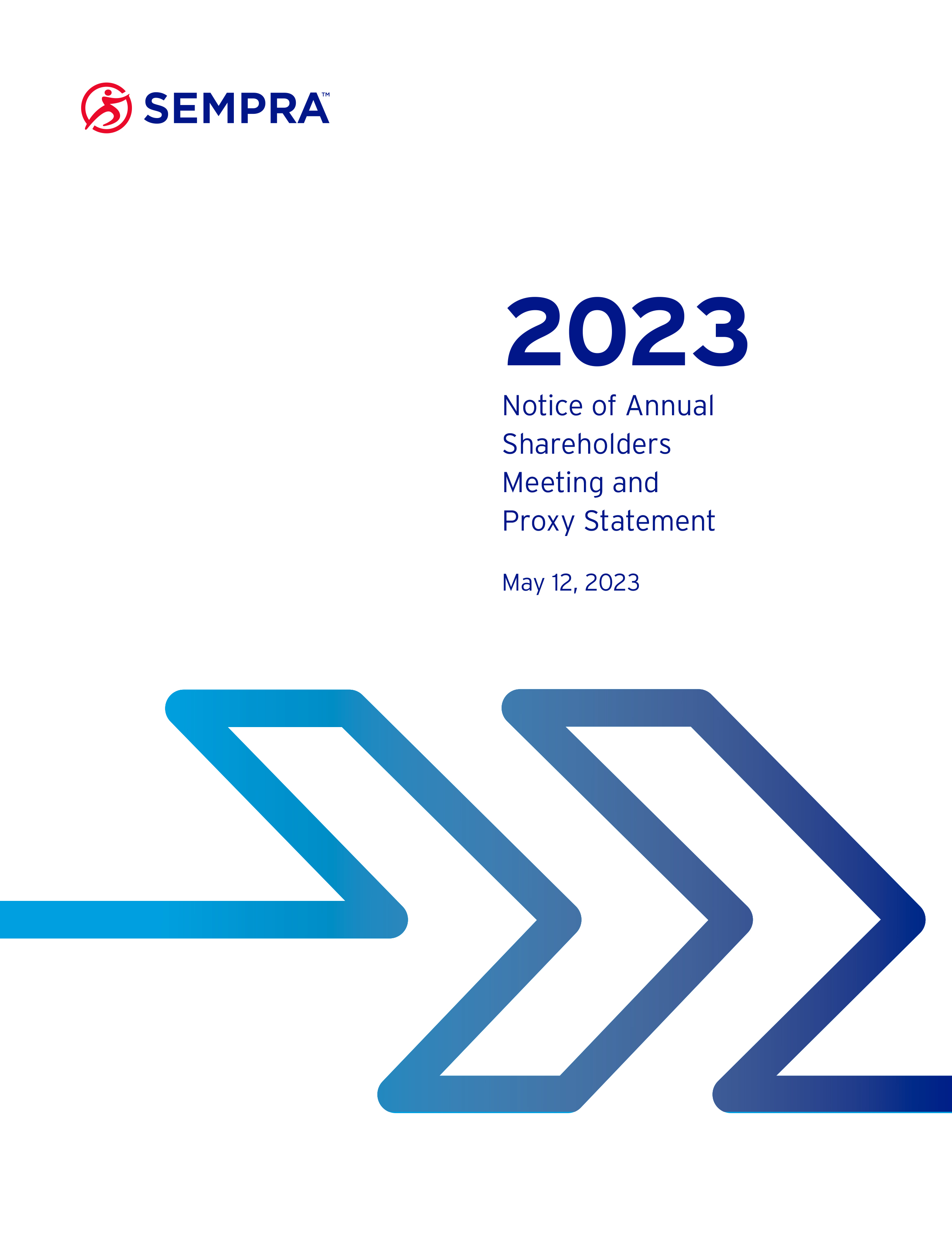 This proxy statement is being provided in connection with the 2023 annual meeting of shareholders of Sempra Energy, doing business and referred to as Sempra (Annual Shareholders Meeting). This summary highlights selected information to assist you in your review of this proxy statement. It does not contain all the information you should consider, and you should read the entire proxy statement carefully before voting. More information regarding the performance of Sempra is available in the company’s Annual Report to Shareholders for the year ended December 31, 2022, which accompanies this proxy statement and is available on the Internet on the company’s website at www.sempra.com/2023-annual-meeting and on the SEC’s website at www.sec.gov. For additional information about the Annual Shareholders Meeting and voting, see “About the Annual Shareholders Meeting and Voting” below. This proxy statement and the accompanying form of proxy card or voting instruction form are first being made available to shareholders on or about March 29, 2023. All website references in our proxy materials are inactive textual references, and the information on, or that can be accessed through, such websites does not constitute a part of these materials.