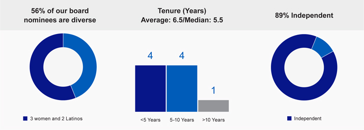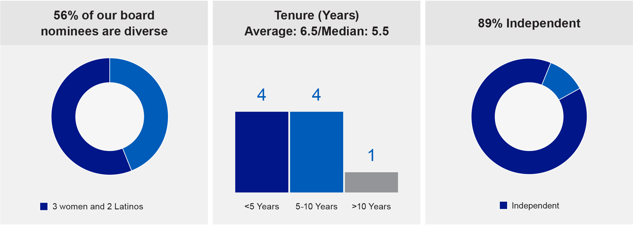 We believe that diversity is an important driver of strong performance. We are proud that our refreshment efforts have enhanced the diversity of our board across key characteristics including tenure, gender and racial and ethnic diversity. Of our director nominees, 56% are women or people of color. The Board also is engaged in active, ongoing dialogue with management about building a diverse, inclusive workforce that advances Sempra’s high-performance culture.