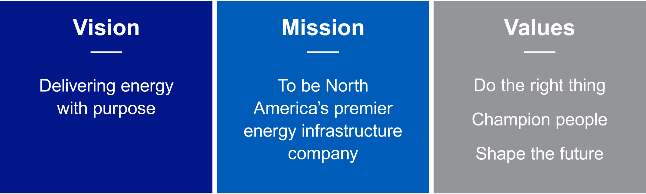 In part, our success turns on efforts to build a high-performance culture centered around our shared values – do the right thing, champion people and shape the future. Our vision, mission and shared values serve to strengthen the alignment of our talented and diverse workforce around our strategy and support our continued growth. Throughout the Sempra family of companies, our talented workforce continues to spearhead safety, innovation and sustainable business practices.