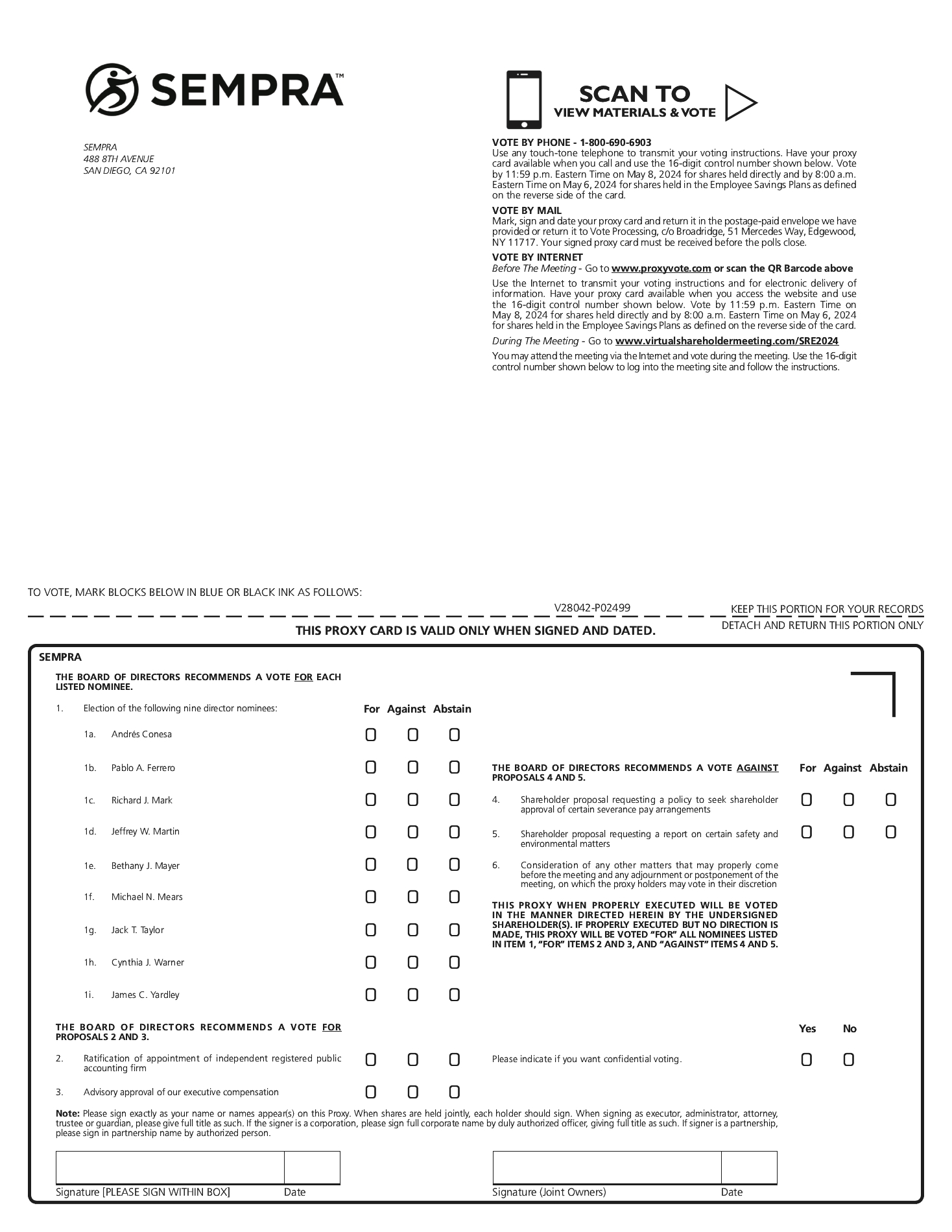 Sempra (the “Company”) provides market-based compensation to its officers and employees to help ensure the Company can both attract and retain a talented workforce. Consistent with the foregoing, the Company places reasonable limitations on certain separation benefits for Executive Officers. The Company will not enter into, establish or adopt any new Severance Pay Agreement with or for the benefit of an Executive Officer that provides for Cash Severance Payments exceeding 2.99 times the sum of the Executive Officer’s Base Salary plus Target Bonus, without seeking shareholder ratification of such Severance Pay Agreement.