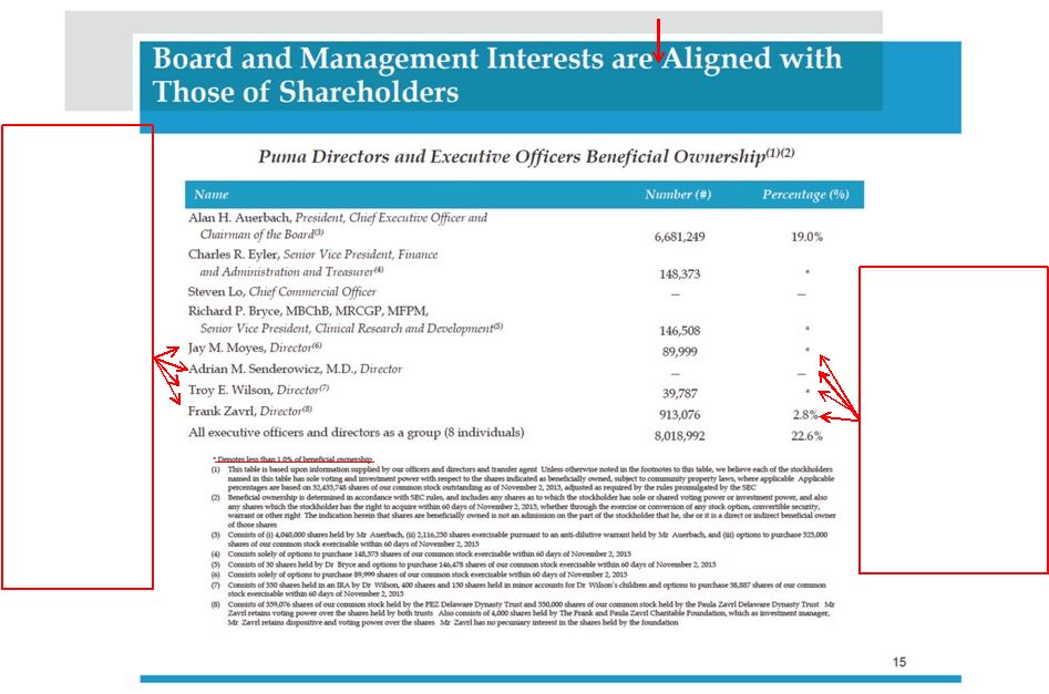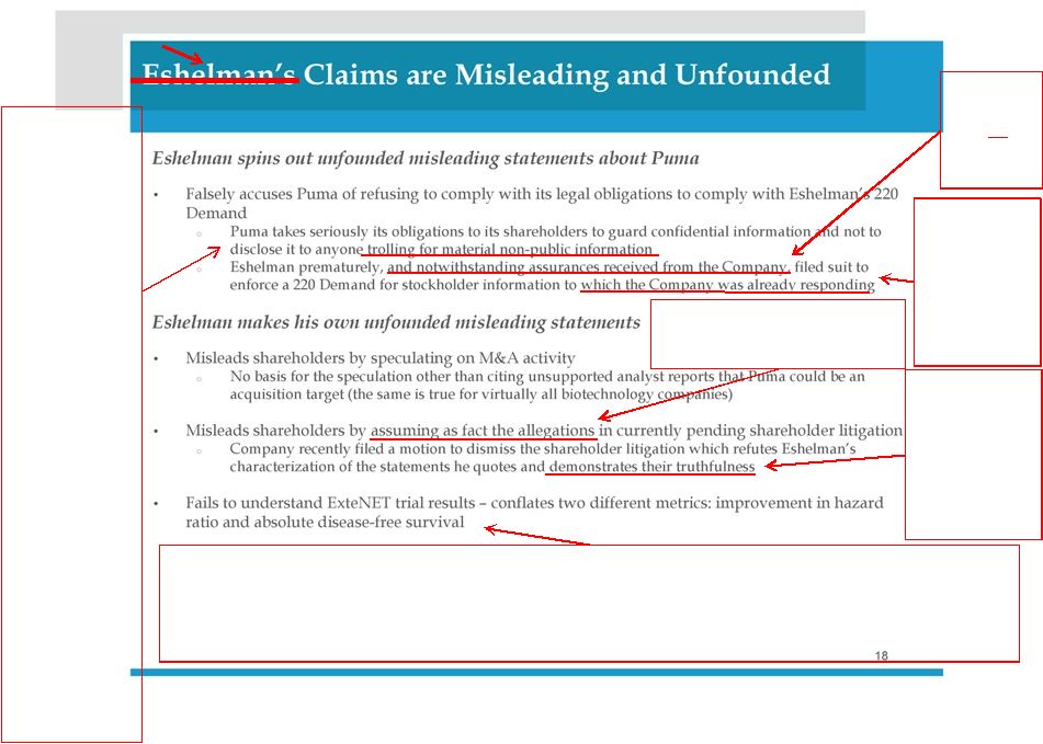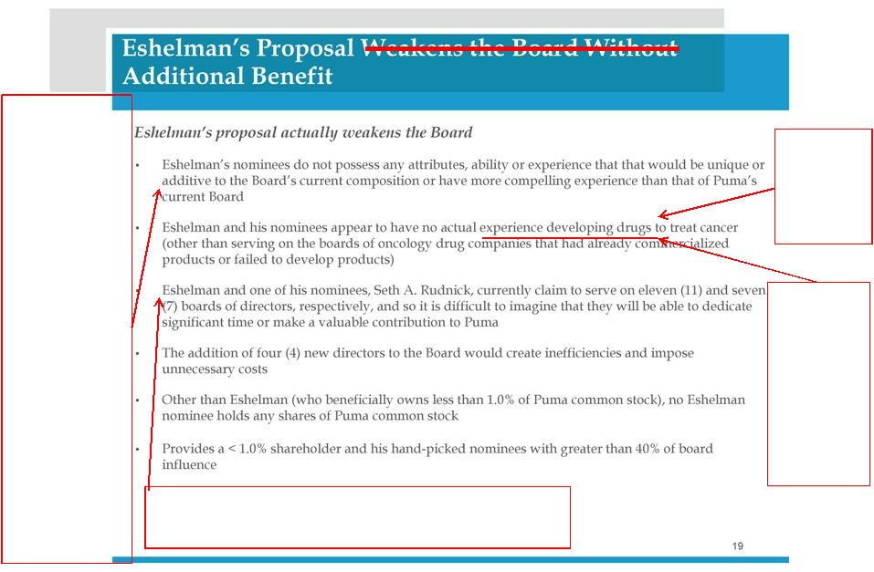 transparency and “skin in the game”: Puma has exhibited an alarming lack of transparency with investors, including Dr. Eshelman, something the Nominees will seek to immediately address if elected. In addition,