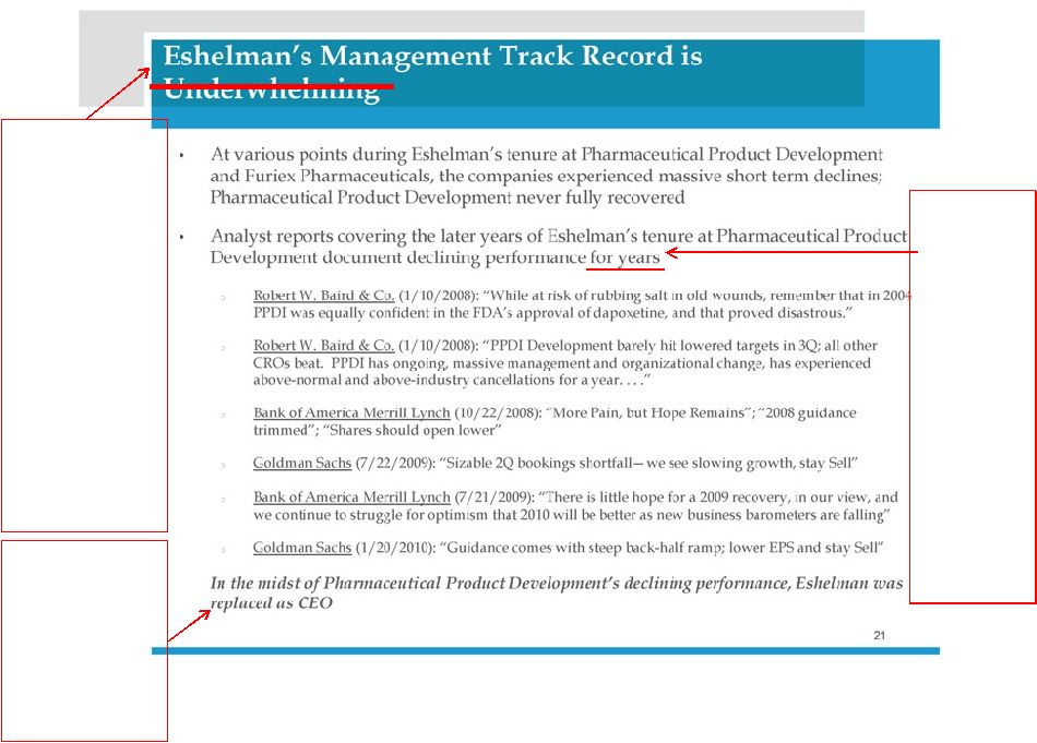 planning and executing the company’s succession plan. The Company neglects that most of these analyst statements came during a two-year period when the overall market was significantly down due to the financial crisis. Dr. Eshelman’s tenure at PPDI was approximately 20 years. By the standards the current board uses to judge its own past, PPDI compares very favorably. PPDI sold at an increase of 421% over its initial listing price, while Cougar’s value only increased by 140%, and was even more volatile in the interim than PPDI, twice experiencing declines that brought it back to its initial listing price. |