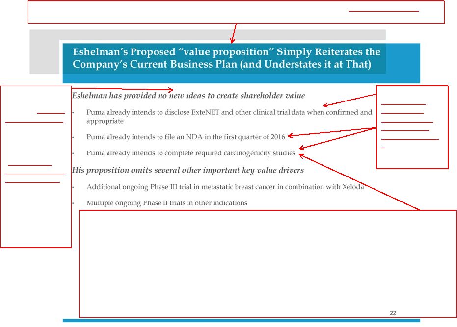 ![]() 1 Debunking Puma’s Claim To Be Developing Stockholder Value Management and Board unable to unlock stockholder value: Puma has a valuable asset that could generate significant value for stockholders if managed correctly. To date, Puma’s current Board and management team have failed to do so. Lack of strategic plan: Puma’s current Board does not appear to have an overall business plan to successfully bring Puma’s product to market. Stockholder hopes are pinned to an eventual acquisition. The nominees DO have a plan: We have outlined a full set of business initiatives in the areas of commercialization, marketing, sales and manufacturing – topics that the Company has never addressed publicly – as well as finance, business development and corporate governance. Puma’s current Board has been tested and failed: The current Board is not up to the task of generating acceptable value for stockholders from Puma’s asset. The four highly qualified and experienced nominees Dr. Eshelman