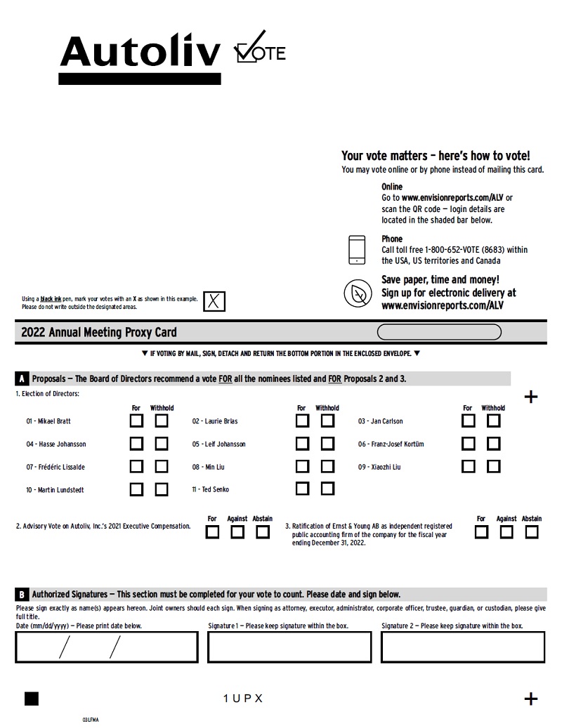 01 - Mikael Bratt 04 - Hasse Johansson 07 - Frédéric Lissalde 02 - Laurie Brlas 05 - Leif Johansson 08 - Min Liu 03 - Jan Carlson 06 - Franz-Josef Kortüm 09 - Xiaozhi Liu For Withhold For Withhold For Withhold 1 U P X 10 - Martin Lundstedt 11 - Ted Senko Using a black ink pen, mark your votes with an X as shown in this example. Please do not write outside the designated areas. 03LFMA + + Proposals — The Board of Directors recommend a vote FOR all the A nominees listed and FOR Proposals 2 and 3. 1. Election of Directors: For Against Abstain Please sign exactly as name(s) appears hereon. Joint owners should each sign. When signing as attorney, executor, administrator, corporate officer, trustee, guardian, or custodian, please give full title. Date (mm/dd/yyyy) — Please print date below. Signature 1 — Please keep signature within the box. Signature 2 — Please keep signature within the box. B Authorized Signatures — This section must be completed for your vote to count. Please date and sign below. qIF VOTING BY MAIL, SIGN, DETACH AND RETURN THE BOTTOM PORTION IN THE ENCLOSED ENVELOPE.q 2022 Annual Meeting Proxy Card For Against Abstain 2. Advisory Vote on Autoliv, Inc.’s 2021 Executive Compensation. 3. Ratification of Ernst & Young AB as independent registered public accounting firm of the company for the fiscal year ending December 31, 2022. Online Go to www.envisionreports.com/ALV or scan the QR code — login details are located in the shaded bar below. Save paper, time and money! Sign up for electronic delivery at www.envisionreports.com/ALV Phone Call toll free 1-800-652-VOTE (8683) within the USA, US territories and Canada You may vote online or by phone instead of mailing this card. Your vote matters – here’s how to vote!