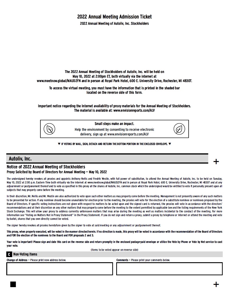 Small steps make an impact. Help the environment by consenting to receive electronic delivery, sign up at www.envisionreports.com/ALV Notice of 2022 Annual Meeting of Stockholders Proxy Solicited by Board of Directors for Annual Meeting — May 10, 2022 The undersigned hereby revokes all proxies and appoints Anthony Nellis and Fredrik Westin, with full power of substitution, to attend the Annual Meeting of Autoliv, Inc. to be held on Tuesday, May 10, 2022 at 2:00 p.m. Eastern Time both virtually via the internet at www.meetnow.global/MAUD2FN and in person at Royal Park Hotel, 600 E. University Drive, Rochester, MI 48307 and at any adjournment or postponement thereof and to vote as specified in this proxy all the shares of Autoliv, Inc. common stock which the undersigned would be entitled to vote if personally present upon all subjects that may properly come before the meeting. In their discretion, Mr. Nellis and Mr. Westin are also authorized to vote upon such other matters as may properly come before the meeting. Management is not presently aware of any such matters to be presented for action. If any nominee should become unavailable for election prior to the meeting, the proxies will vote for the election of a substitute nominee or nominees proposed by the Board of Directors. If specific voting instructions are not given with respect to matters to be acted upon and the signed card is returned, the proxies will vote in accordance with the directors’ recommendations and at their discretion on any other matters that may properly come before the meeting to the extent permitted by applicable law and the listing requirements of the New York Stock Exchange. This will allow your proxy to address currently unforeseen matters that may arise during the meeting as well as matters incidental to the conduct of the meeting. For more information see “Voting on Matters Not in Proxy Statement” in the Proxy Statement. If you do not sign and return a proxy, submit a proxy by telephone or Internet or attend the meeting and vote by ballot, shares that you own directly cannot be voted. The signer hereby revokes all proxies heretofore given by the signer to vote at said meeting or any adjournment or postponement thereof. This proxy, when properly executed, will be voted in the manner directed herein. If no direction is made, this proxy will be voted in accordance with the recommendation of the Board of Directors and FOR the election of the nominees to the Board and FOR proposals 2 and 3. Your vote is important! Please sign and date this card on the reverse side and return promptly in the enclosed postage-paid envelope or utilize the Vote by Phone or Vote by Net service to cast your vote. (Items to be voted appear on reverse side) Autoliv, Inc. qIF VOTING BY MAIL, SIGN, DETACH AND RETURN THE BOTTOM PORTION IN THE ENCLOSED ENVELOPE.q Change of Address — Please print new address below. Comments — Please print your comments below. C Non-Voting Items + + Important notice regarding the Internet availability of proxy materials for the Annual Meeting of Stockholders. The material is available at: www.envisionreports.com/ALV The 2022 Annual Meeting of Stockholders of Autoliv, Inc. will be held on May 10, 2022 at 2:00pm ET, both virtually via the internet at www.meetnow.global/MAUD2FN and in person at Royal Park Hotel, 600 E. University Drive, Rochester, MI 48307. To access the virtual meeting, you must have the information that is printed in the shaded bar located on the reverse side of this form. 2022 Annual Meeting Admission Ticket 2022 Annual Meeting of Autoliv, Inc. Stockholders