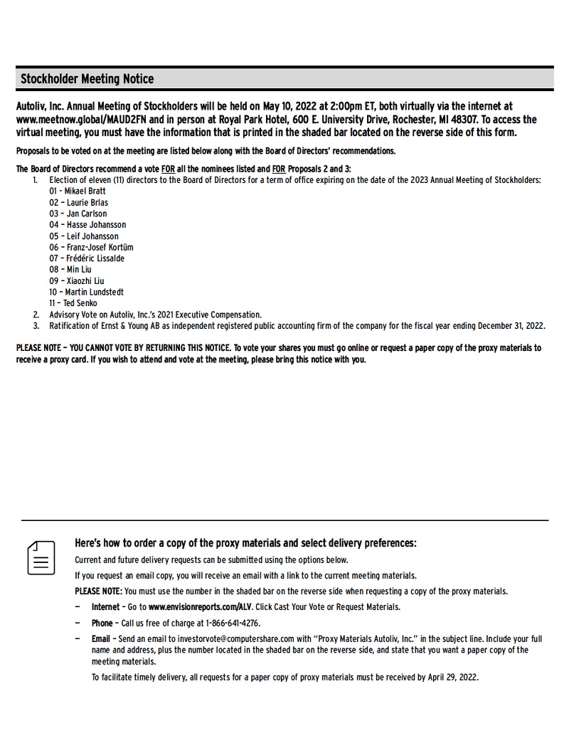 Here’s how to order a copy of the proxy materials and select delivery preferences: Current and future delivery requests can be submitted using the options below. If you request an email copy, you will receive an email with a link to the current meeting materials. PLEASE NOTE: You must use the number in the shaded bar on the reverse side when requesting a copy of the proxy materials. — Internet – Go to www.envisionreports.com/ALV. Click Cast Your Vote or Request Materials. — Phone – Call us free of charge at 1-866-641-4276. — Email – Send an email to investorvote@computershare.com with “Proxy Materials Autoliv, Inc.” in the subject line. Include your full name and address, plus the number located in the shaded bar on the reverse side, and state that you want a paper copy of the meeting materials. To facilitate timely delivery, all requests for a paper copy of proxy materials must be received by April 29, 2022. Autoliv, Inc. Annual Meeting of Stockholders will be held on May 10, 2022 at 2:00pm ET, both virtually via the internet at www.meetnow.global/MAUD2FN and in person at Royal Park Hotel, 600 E. University Drive, Rochester, MI 48307. To access the virtual meeting, you must have the information that is printed in the shaded bar located on the reverse side of this form. Proposals to be voted on at the meeting are listed below along with the Board of Directors’ recommendations. The Board of Directors recommend a vote FOR all the nominees listed and FOR Proposals 2 and 3: 1. Election of eleven (11) directors to the Board of Directors for a term of office expiring on the date of the 2023 Annual Meeting of Stockholders: 01 - Mikael Bratt 02 – Laurie Brlas 03 – Jan Carlson 04 – Hasse Johansson 05 – Leif Johansson 06 – Franz-Josef Kortüm 07 – Frédéric Lissalde 08 – Min Liu 09 – Xiaozhi Liu 10 – Martin Lundstedt 11 – Ted Senko 2. Advisory Vote on Autoliv, Inc.’s 2021 Executive Compensation. 3. Ratification of Ernst & Young AB as independent registered public accounting firm of the company for the fiscal year ending December 31, 2022. PLEASE NOTE – YOU CANNOT VOTE BY RETURNING THIS NOTICE. To vote your shares you must go online or request a paper copy of the proxy materials to receive a proxy card. If you wish to attend and vote at the meeting, please bring this notice with you. Stockholder Meeting Notice