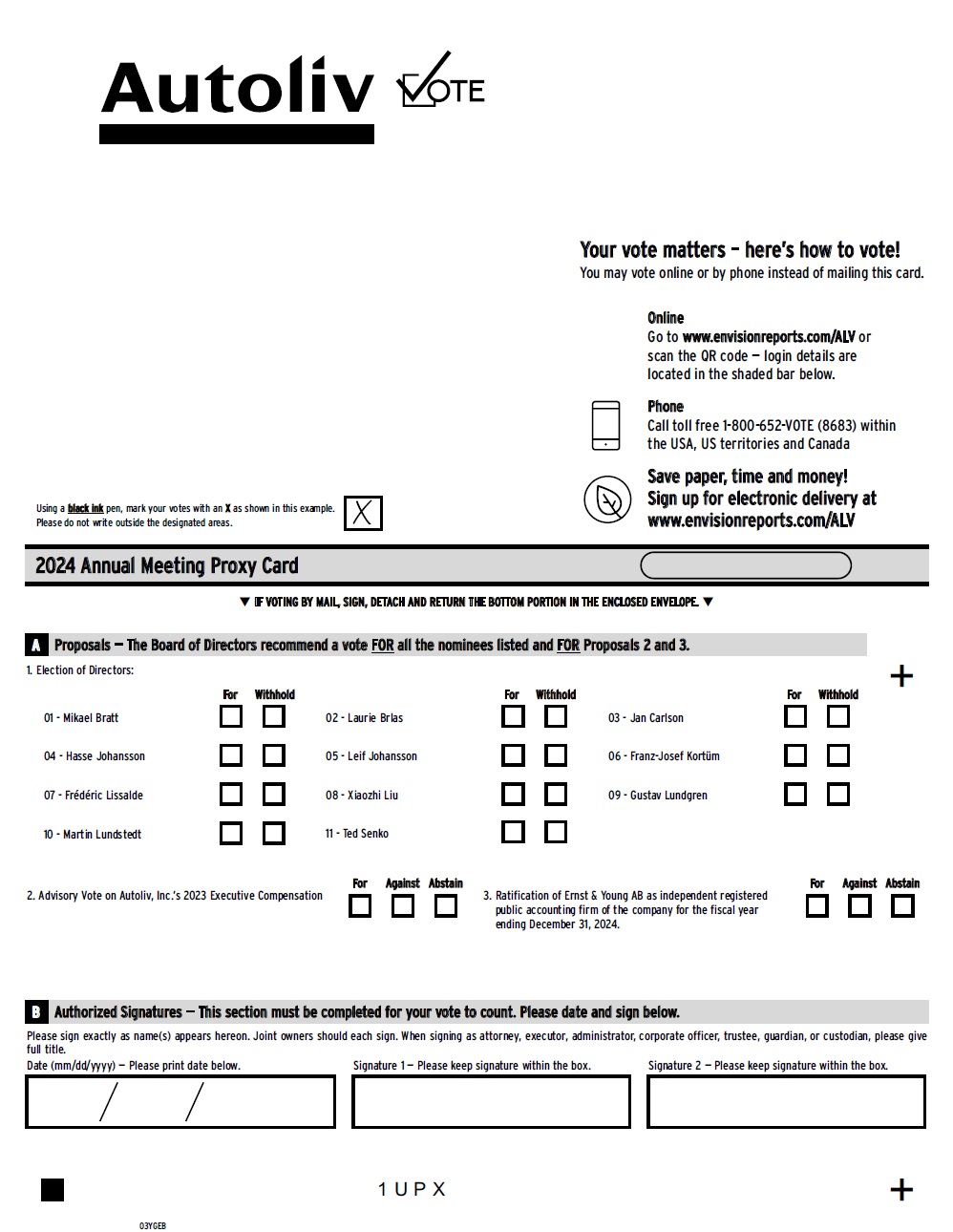 01 - Mikael Bratt 04 - Hasse Johansson 07 - Frédéric Lissalde 02 - Laurie Brlas 05 - Leif Johansson 08 - Xiaozhi Liu 03 - Jan Carlson 06 - Franz-Josef Kortüm 09 - Gustav Lundgren For Withhold For Withhold For Withhold 1 U P X 10 - Martin Lundstedt 11 - Ted Senko Using a black ink pen, mark your votes with an X as shown in this example. Please do not write outside the designated areas. 03YGEB + + Proposals — The Board of Directors recommend a vote FOR all the nominees listed and A FOR Proposals 2 and 3. 1. Election of Directors: For Against Abstain Please sign exactly as name(s) appears hereon. Joint owners should each sign. When signing as attorney, executor, administrator, corporate officer, trustee, guardian, or custodian, please give full title. Date (mm/dd/yyyy) — Please print date below. Signature 1 — Please keep signature within the box. Signature 2 — Please keep signature within the box. B Authorized Signatures — This section must be completed for your vote to count. Please date and sign below. qIF VOTING BY MAIL, SIGN, DETACH AND RETURN THE BOTTOM PORTION IN THE ENCLOSED ENVELOPE.q 2024 Annual Meeting Proxy Card 2. Advisory Vote on Autoliv, Inc.’s 2023 Executive Compensation For Against Abstain 3. Ratification of Ernst & Young AB as independent registered public accounting firm of the company for the fiscal year ending December 31, 2024. Online Go to www.envisionreports.com/ALV or scan the QR code — login details are located in the shaded bar below. Save paper, time and money! Sign up for electronic delivery at www.envisionreports.com/ALV Phone Call toll free 1-800-652-VOTE (8683) within the USA, US territories and Canada You may vote online or by phone instead of mailing this card. Your vote matters – here’s how to vote!