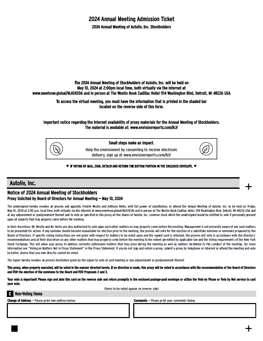 Small steps make an impact. Help the environment by consenting to receive electronic delivery, sign up at www.envisionreports.com/ALV Notice of 2024 Annual Meeting of Stockholders Proxy Solicited by Board of Directors for Annual Meeting — May 10, 2024 The undersigned hereby revokes all proxies and appoints Fredrik Westin and Anthony Nellis, with full power of substitution, to attend the Annual Meeting of Autoliv, Inc. to be held on Friday, May 10, 2024 at 2:00 p.m. local time, both virtually via the internet at www.meetnow.global/MJGH2D6 and in person at The Westin Book Cadillac Hotel, 1114 Washington Blvd, Detroit, MI 48226 USA and at any adjournment or postponement thereof and to vote as specified in this proxy all the shares of Autoliv, Inc. common stock which the undersigned would be entitled to vote if personally present upon all subjects that may properly come before the meeting. In their discretion, Mr. Westin and Mr. Nellis are also authorized to vote upon such other matters as may properly come before the meeting. Management is not presently aware of any such matters to be presented for action. If any nominee should become unavailable for election prior to the meeting, the proxies will vote for the election of a substitute nominee or nominees proposed by the Board of Directors. If specific voting instructions are not given with respect to matters to be acted upon and the signed card is returned, the proxies will vote in accordance with the directors’ recommendations and at their discretion on any other matters that may properly come before the meeting to the extent permitted by applicable law and the listing requirements of the New York Stock Exchange. This will allow your proxy to address currently unforeseen matters that may arise during the meeting as well as matters incidental to the conduct of the meeting. For more information see “Voting on Matters Not in Proxy Statement” in the Proxy Statement. If you do not sign and return a proxy, submit a proxy by telephone or Internet or attend the meeting and vote by ballot, shares that you own directly cannot be voted. The signer hereby revokes all proxies heretofore given by the signer to vote at said meeting or any adjournment or postponement thereof. This proxy, when properly executed, will be voted in the manner directed herein. If no direction is made, this proxy will be voted in accordance with the recommendation of the Board of Directors and FOR the election of the nominees to the Board and FOR Proposals 2 and 3. Your vote is important! Please sign and date this card on the reverse side and return promptly in the enclosed postage-paid envelope or utilize the Vote by Phone or Vote by Net service to cast your vote. (Items to be voted appear on reverse side) Autoliv, Inc. qIF VOTING BY MAIL, SIGN, DETACH AND RETURN THE BOTTOM PORTION IN THE ENCLOSED ENVELOPE.q Change of Address — Please print new address below. Comments — Please print your comments below. C Non-Voting Items + + Important notice regarding the Internet availability of proxy materials for the Annual Meeting of Stockholders. The material is available at: www.envisionreports.com/ALV The 2024 Annual Meeting of Stockholders of Autoliv, Inc. will be held on May 10, 2024 at 2:00pm local time, both virtually via the internet at www.meetnow.global/MJGH2D6 and in person at The Westin Book Cadillac Hotel 1114 Washington Blvd, Detroit, MI 48226 USA To access the virtual meeting, you must have the information that is printed in the shaded bar located on the reverse side of this form. 2024 Annual Meeting Admission Ticket 2024 Annual Meeting of Autoliv, Inc. Stockholders