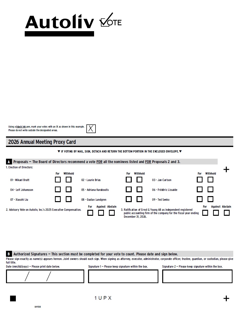 01 - Mikael Bratt 04 - Leif Johansson 07 - Xiaozhi Liu 02 - Laurie Brlas 05 - Adriana Karaboutis 08 - Gustav Lundgren 03 - Jan Carlson 06 - Frédéric Lissalde 09 - Ted Senko 1 U P X For Withhold For Withhold For Withhold Proposals — The Board of Directors recommend a vote FOR A all the nominees listed and FOR Proposals 2 and 3. 0495IB 2. Advisory Vote on Autoliv, Inc.’s 2025 Executive Compensation. 3. Ratification of Ernst & Young AB as independent registered public accounting firm of the company for the fiscal year ending December 31, 2026. 1. Election of Directors: For Against Abstain For Against Abstain Please sign exactly as name(s) appears hereon. Joint owners should each sign. When signing as attorney, executor, administrator, corporate officer, trustee, guardian, or custodian, please give full title. Date (mm/dd/yyyy) — Please print date below. Signature 1 — Please keep signature within the box. Signature 2 — Please keep signature within the box. B Authorized Signatures — This section must be completed for your vote to count. Please date and sign below. 2026 Annual Meeting Proxy Card Using a black ink pen, mark your votes with an X as shown in this example. Please do not write outside the designated areas. q IF VOTING BY MAIL, SIGN, DETACH AND RETURN THE BOTTOM PORTION IN THE ENCLOSED ENVELOPE.q