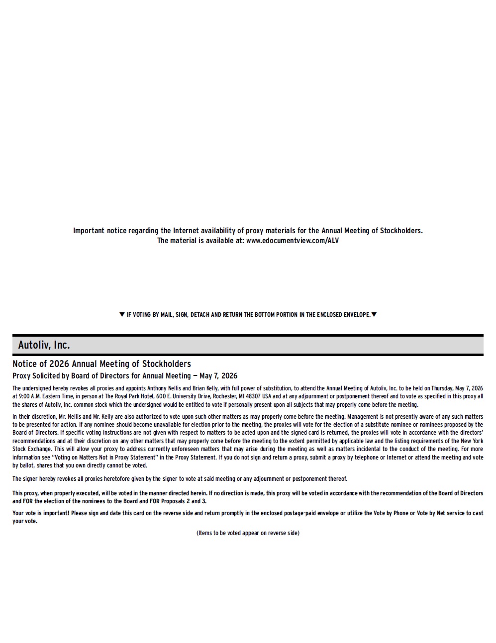 Notice of 2026 Annual Meeting of Stockholders Proxy Solicited by Board of Directors for Annual Meeting — May 7, 2026 The undersigned hereby revokes all proxies and appoints Anthony Nellis and Brian Kelly, with full power of substitution, to attend the Annual Meeting of Autoliv, Inc. to be held on Thursday, May 7, 2026 at 9:00 A.M. Eastern Time, in person at The Royal Park Hotel, 600 E. University Drive, Rochester, MI 48307 USA and at any adjournment or postponement thereof and to vote as specified in this proxy all the shares of Autoliv, Inc. common stock which the undersigned would be entitled to vote if personally present upon all subjects that may properly come before the meeting. In their discretion, Mr. Nellis and Mr. Kelly are also authorized to vote upon such other matters as may properly come before the meeting. Management is not presently aware of any such matters to be presented for action. If any nominee should become unavailable for election prior to the meeting, the proxies will vote for the election of a substitute nominee or nominees proposed by the Board of Directors. If specific voting instructions are not given with respect to matters to be acted upon and the signed card is returned, the proxies will vote in accordance with the directors’ recommendations and at their discretion on any other matters that may properly come before the meeting to the extent permitted by applicable law and the listing requirements of the New York Stock Exchange. This will allow your proxy to address currently unforeseen matters that may arise during the meeting as well as matters incidental to the conduct of the meeting. For more information see “Voting on Matters Not in Proxy Statement” in the Proxy Statement. If you do not sign and return a proxy, submit a proxy by telephone or Internet or attend the meeting and vote by ballot, shares that you own directly cannot be voted. The signer hereby revokes all proxies heretofore given by the signer to vote at said meeting or any adjournment or postponement thereof. This proxy, when properly executed, will be voted in the manner directed herein. If no direction is made, this proxy will be voted in accordance with the recommendation of the Board of Directors and FOR the election of the nominees to the Board and FOR Proposals 2 and 3. Your vote is important! Please sign and date this card on the reverse side and return promptly in the enclosed postage-paid envelope or utilize the Vote by Phone or Vote by Net service to cast your vote. (Items to be voted appear on reverse side) Autoliv, Inc. q IF VOTING BY MAIL, SIGN, DETACH AND RETURN THE BOTTOM PORTION IN THE ENCLOSED ENVELOPE.q Important notice regarding the Internet availability of proxy materials for the Annual Meeting of Stockholders. The material is available at: www.edocumentview.com/ALV