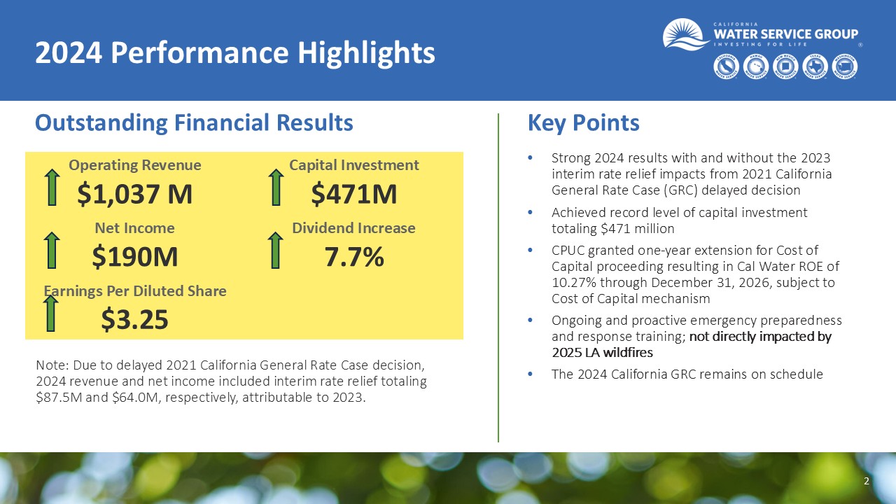 2 Note: Due to delayed 2021 California General Rate Case decision, 2024 revenue and net income included interim rate relief totaling $87.5M and $64.0M, respectively, attributable to 2023. 2024 Performance Highlights Capital Investment $471M Operating Revenue $1,037 M Dividend Increase 7.7% Net Income $190M Earnings Per Diluted Share $3.25 Outstanding Financial Results Key Points • Strong 2024 results with and without the 2023 interim rate relief impacts from 2021 California General Rate Case (GRC) delayed decision • Achieved record level of capital investment totaling $471 million • CPUC granted one - year extension for Cost of Capital proceeding resulting in Cal Water ROE of 10.27% through December 31, 2026, subject to Cost of Capital mechanism • Ongoing and proactive emergency preparedness and response training; not directly impacted by 2025 LA wildfires • T he 2024 California GRC remains on schedule