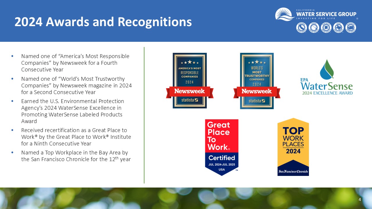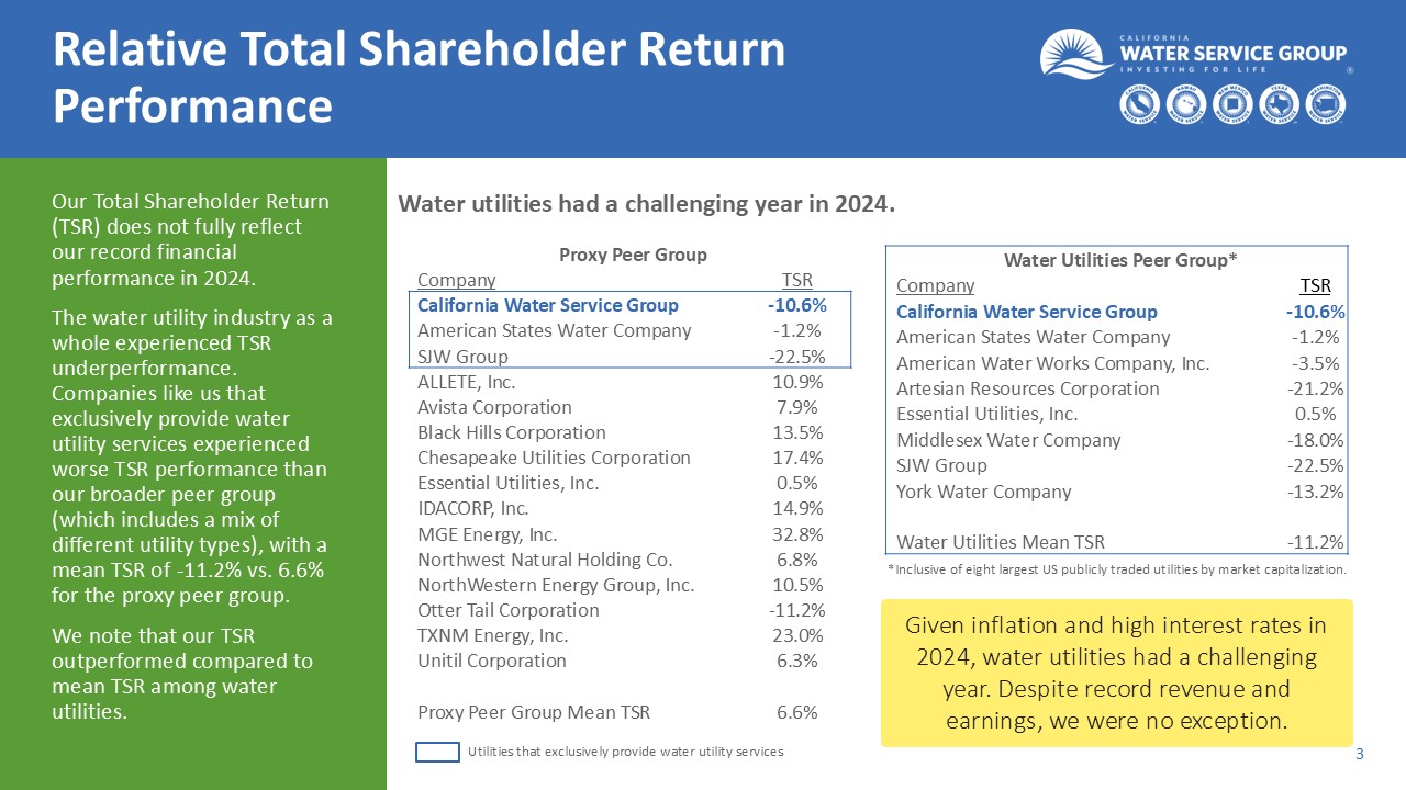 Water utilities had a challenging year in 2024. Our Total Shareholder Return (TSR) does not fully reflect our record financial performance in 2024. The water utility industry as a whole experienced TSR underperformance. Companies like us that exclusively provide water utility services experienced worse TSR performance than our broader peer group (which includes a mix of different utility types), with a mean TSR of - 11.2% vs. 6.6% for the proxy peer group. We note that our TSR outperformed compared to mean TSR among water utilities. Relative Total Shareholder Return Performance Proxy Peer Group TSR Company - 10.6% California Water Service Group - 1.2% American States Water Company - 22.5% SJW Group 10.9% ALLETE, Inc. 7.9% Avista Corporation 13.5% Black Hills Corporation 17.4% Chesapeake Utilities Corporation 0.5% Essential Utilities, Inc. 14.9% IDACORP, Inc. 32.8% MGE Energy, Inc. 6.8% Northwest Natural Holding Co. 10.5% NorthWestern Energy Group, Inc. - 11.2% Otter Tail Corporation 23.0% TXNM Energy, Inc. 6.3% Unitil Corporation 6.6% Proxy Peer Group Mean TSR Water Utilities Peer Group* TSR Company - 10.6% California Water Service Group - 1.2% American States Water Company - 3.5% American Water Works Company, Inc. - 21.2% Artesian Resources Corporation 0.5% Essential Utilities, Inc. - 18.0% Middlesex Water Company - 22.5% SJW Group - 13.2% York Water Company - 11.2% Water Utilities Mean TSR Given inflation and high interest rates in 2024, water utilities had a challenging year. Despite record revenue and earnings, we were no exception. 3 Utilities that exclusively provide water utility services *Inclusive of eight largest US publicly traded utilities by market capitalization.