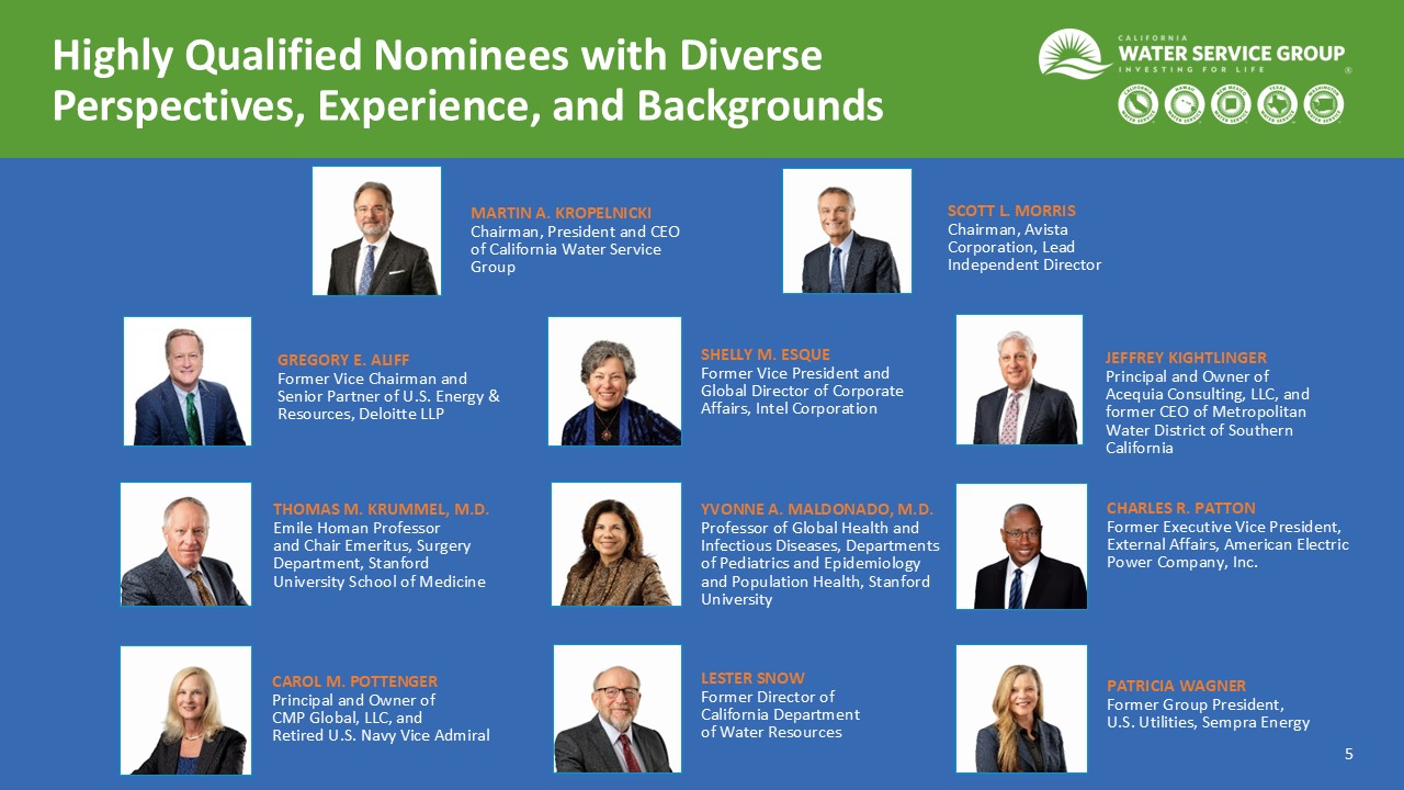 Highly Qualified Nominees with Diverse Perspectives, Experience, and Backgrounds GREGORY E. ALIFF Former Vice Chairman and Senior Partner of U.S. Energy & Resources, Deloitte LLP SHELLY M. ESQUE Former Vice President and Global Director of Corporate Affairs, Intel Corporation MARTIN A. KROPELNICKI Chairman, President and CEO of California Water Service Group THOMAS M. KRUMMEL, M.D. Emile Homan Professor and Chair Emeritus, Surgery Department, Stanford University School of Medicine YVONNE A. MALDONADO, M.D. Professor of Global Health and Infectious Diseases, Departments of Pediatrics and Epidemiology and Population Health, Stanford University SCOTT L. MORRIS Chairman, Avista Corporation, Lead Independent Director CAROL M. POTTENGER Principal and Owner of CMP Global, LLC, and Retired U.S. Navy Vice Admiral LESTER SNOW Former Director of California Department of Water Resources PATRICIA WAGNER Former Group President, U.S. Utilities, Sempra Energy JEFFREY KIGHTLINGER Principal and Owner of Acequia Consulting, LLC, and former CEO of Metropolitan Water District of Southern California CHARLES R. PATTON Former Executive Vice President, External Affairs, American Electric Power Company, Inc. 5