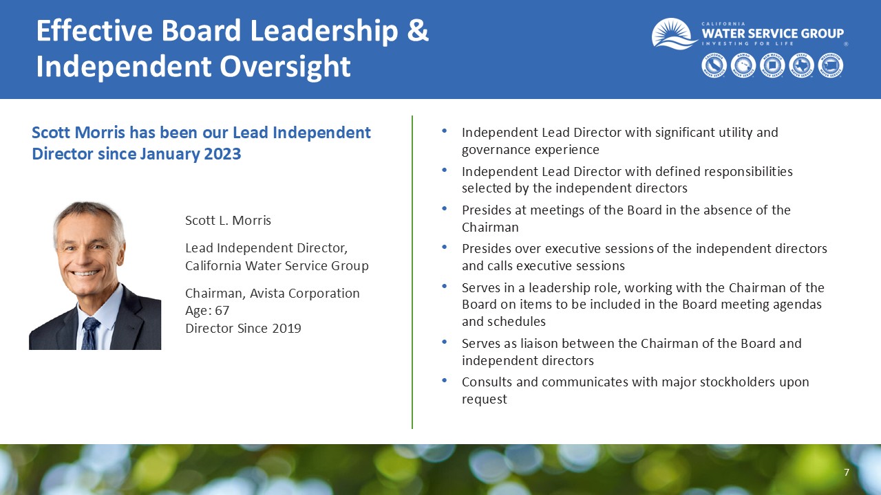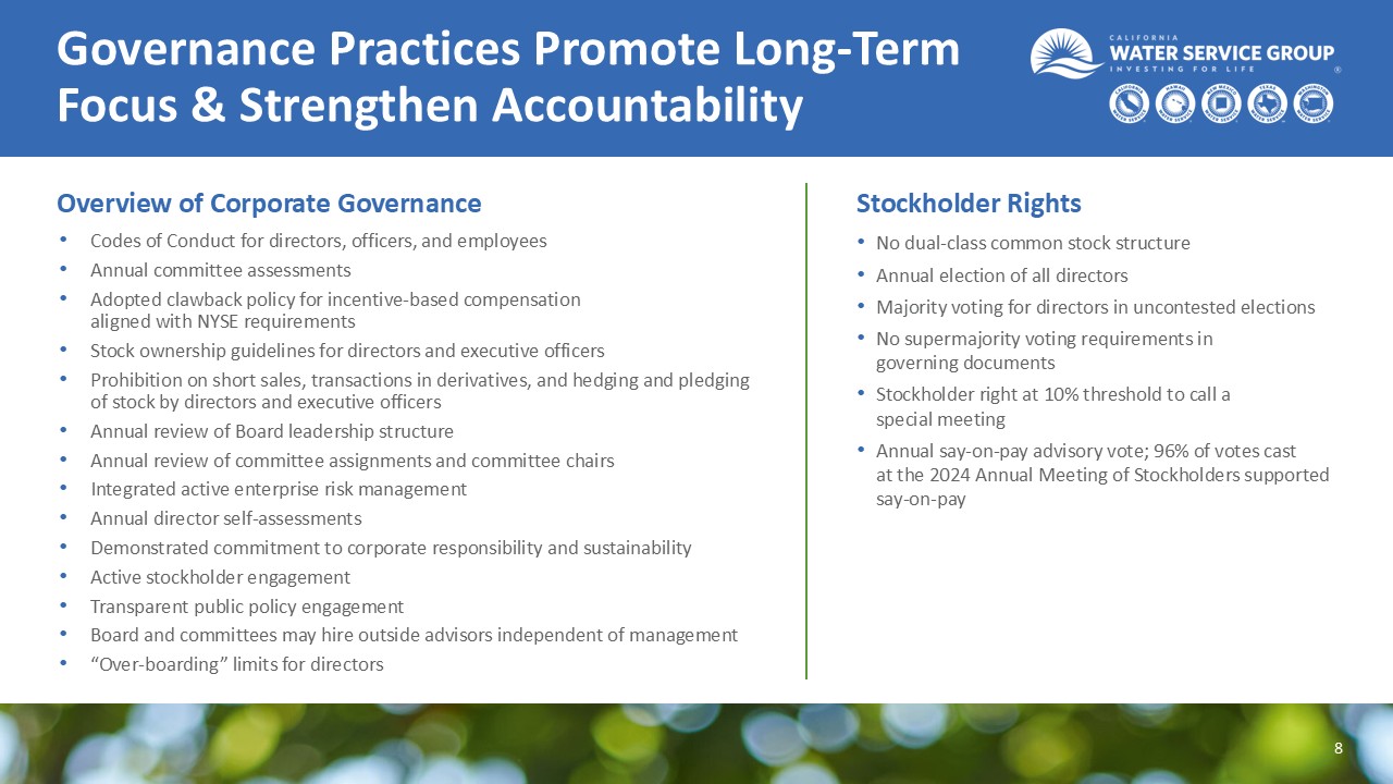 • Independent Lead Director with significant utility and governance experience • Independent Lead Director with defined responsibilities selected by the independent directors • Presides at meetings of the Board in the absence of the Chairman • Presides over executive sessions of the independent directors and calls executive sessions • Serves in a leadership role, working with the Chairman of the Board on items to be included in the Board meeting agendas and schedules • Serves as liaison between the Chairman of the Board and independent directors • Consults and communicates with major stockholders upon request Effective Board Leadership & Independent Oversight 7 Scott Morris has been our Lead Independent Director since January 2023 Scott L. Morris Lead Independent Director, California Water Service Group Chairman, Avista Corporation Age: 67 Director Since 2019